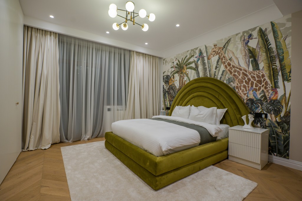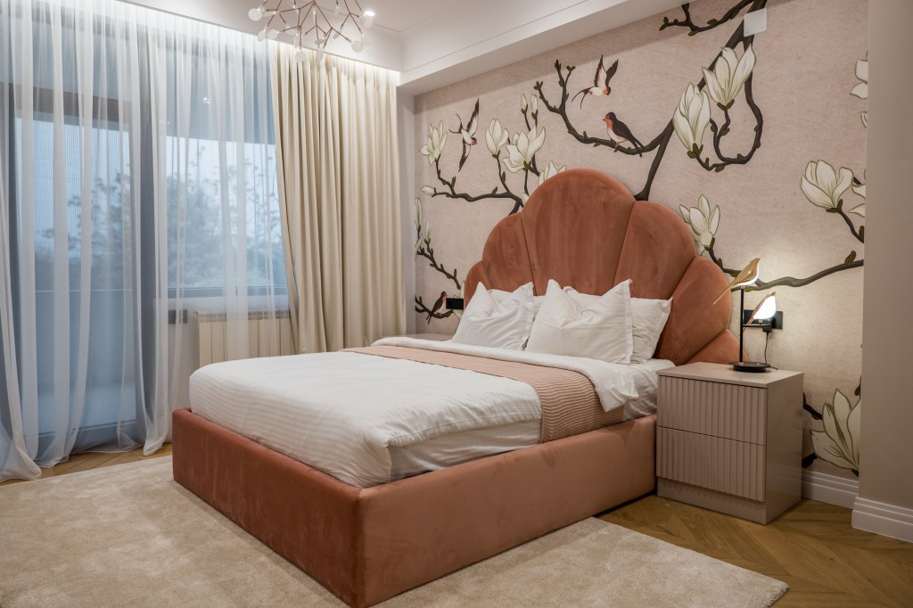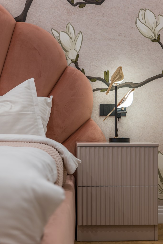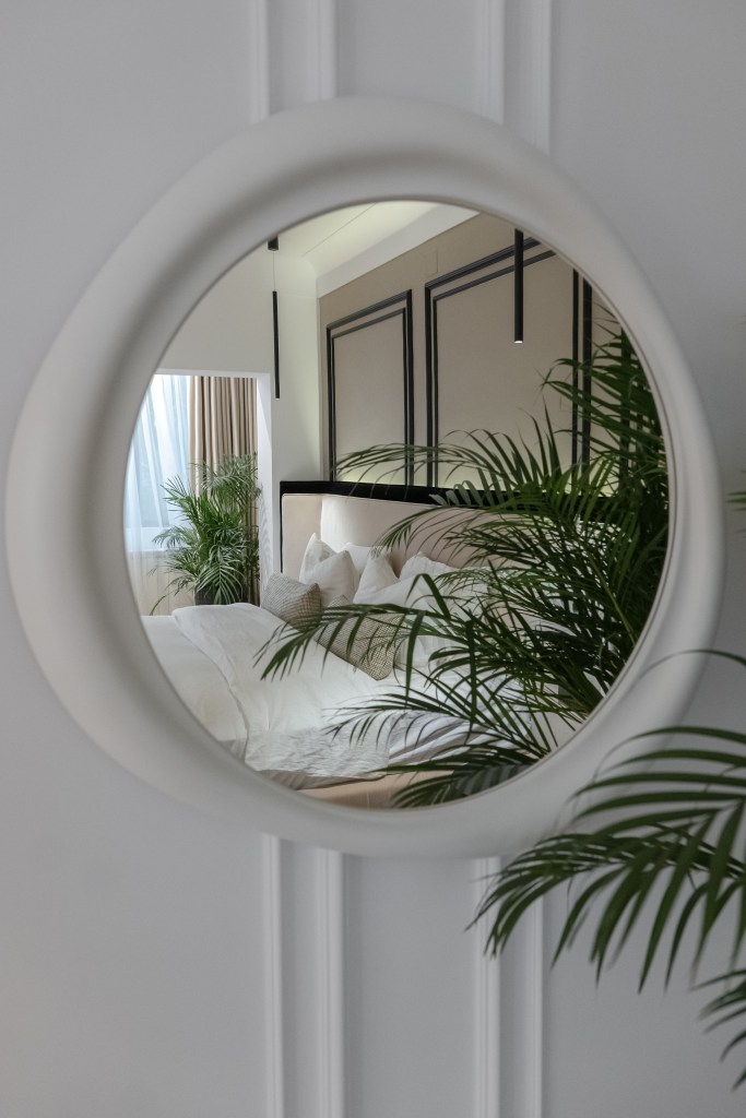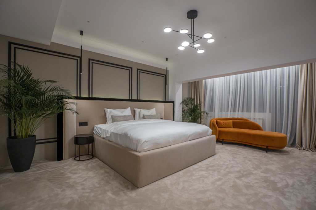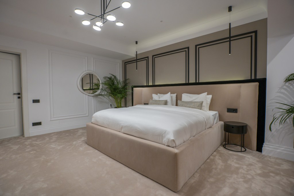 În dormitorul matrimonial, texturile și cromatica sunt menite să transforme spațiul într-un cuib de relaxare. Mobilierul este minimal, cu accent pus pe confort. Încăperea dispune de un dressing spațios cu insulă, chiar la intrarea în încăpere, așa că nu a mai fost nevoie de dulapuri care să sufoce, inutil, amenajarea. Ana a gândit și un colț de lectură, lângă fereastră, cu o canapea cărămizie care este pata de culoare într-un decor predominant neutru. Interesantă este și ideea de a vopsi în negru profilele decorative de pe perete pentru a crea contrast.