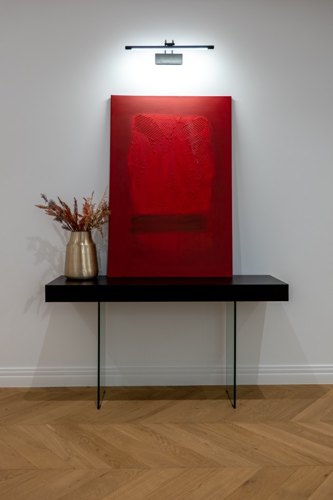„Intrarea în casă, biroul și baia de oaspeți sunt delimitate printr-o ușă de sticlă cu profil metalic. În felul acesta, ne-am asigurat că aerul rece de afară nu intră direct în zona de living”, explică Ana. „În hol am integrat un dressing generos cu spațiu de depozitare pentru încălțăminte, o consolă cu sertare și o oglindă iluminată cu led care dă senzația de adâncime și tridimensionalitate. De o parte și de alta a oglinzii se află două calorifere decorative, pe care le-am preluat odată cu casa și pe care beneficiarii au dorit să le păstreze. Am creat o frumoasă simetrie cu ajutorul lor. Le-am vopsit negru și le-am transformat în elemente decorative de efect”.