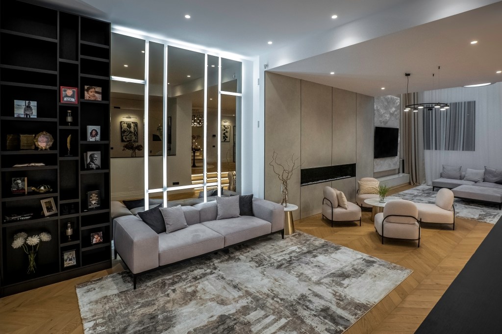 Livingul are o suprafață de 120 metri pătrați. Ana își aduce aminte că la prima vizită pe șantier a fost impresionată de dimensiunile încăperii și de cantitatea de lumină naturală care ajungea în interior. Spațiul este dispus oarecum pe lungime. Din zona de intrare se formează un culoar lung care merge până în dining, iar dorința proprietarilor a fost să scape de acest efect de „hală industrială”. Ana a venit cu soluția unei mese rotunde care să împartă vizual încăperea. Piesa de mobilier este pusă în valoare de un corp de iluminat decorativ, achiziționat de la ARN Store. Spațiul deschis de la parterul casei din Pipera include trei zone separate: zonă de cinema cu canapea generoasă, un loc de socializare și snack-uri cu măsuță de cafea și fotolii confortabile, așezate în dreptul șemineului și un colțișor de lectură, cu bibliotecă.