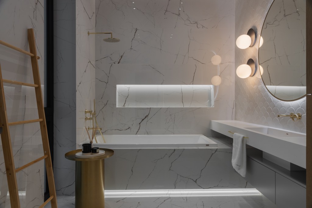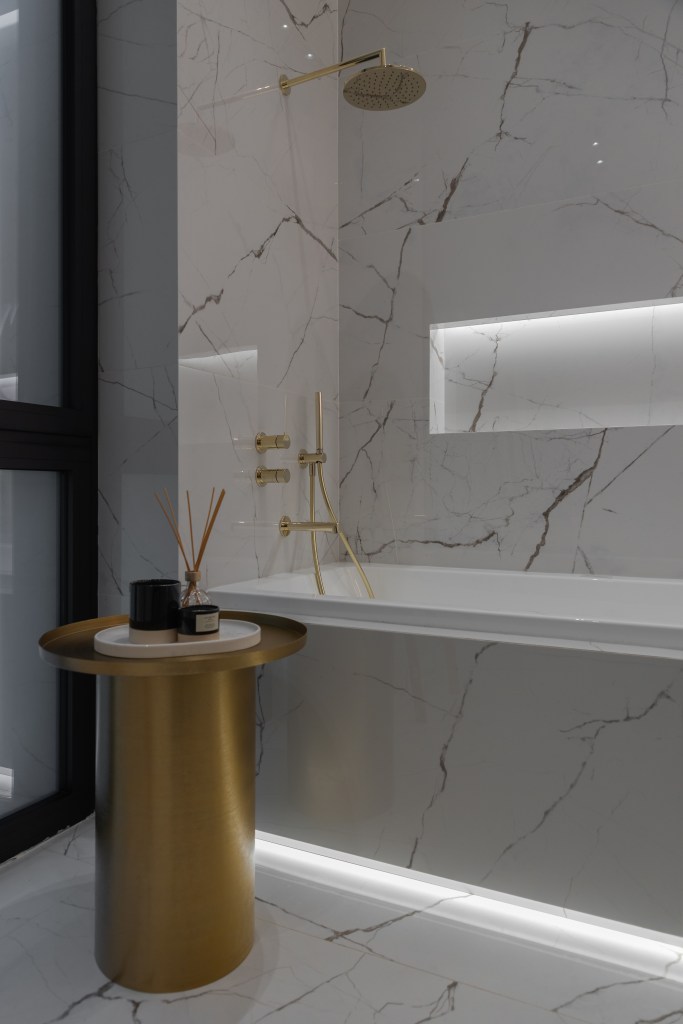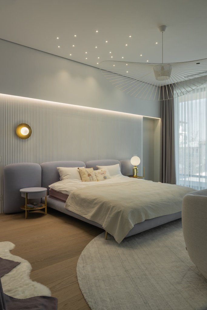 În dormitorul fetei, atenția cade pe patul și accesoriile cu un design special de la Baxter, completate de corpurile de iluminat cu accente aurii și a profilelor decorative montate pe peretele din spatele lui. Zona patului este delimitată, la nivelul plafonului, printr-o soluție de iluminat care creează impresia unui cer acoperit de stele.