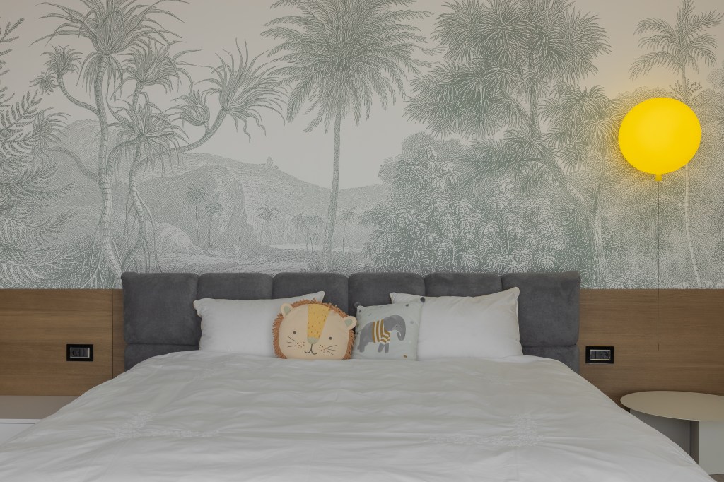 Imaginea exploratorului este cea care a trasat direcția de amenajare în dormitorul băiatului. Ideea este susținută de alegerea unui fototapet cu imaginea junglei și câteva corpuri de iluminat și accesorii care vin în completarea temei propuse. Veioza în formă de broască țestoasă de la Qeeboo este piesa de rezistență a acestei camere. În anumite zone ale camerei, pereții sunt zugrăviți cu lavabilă cu efect de tablă de scris, unde copiii pot desena cu cretă colorată după bunul plac.