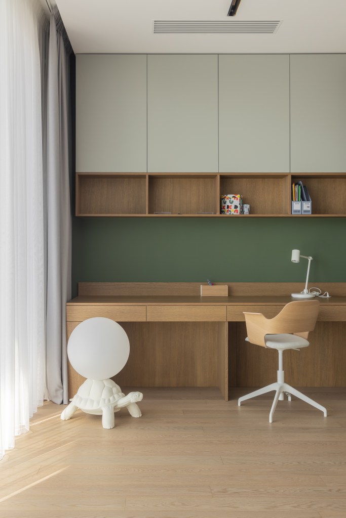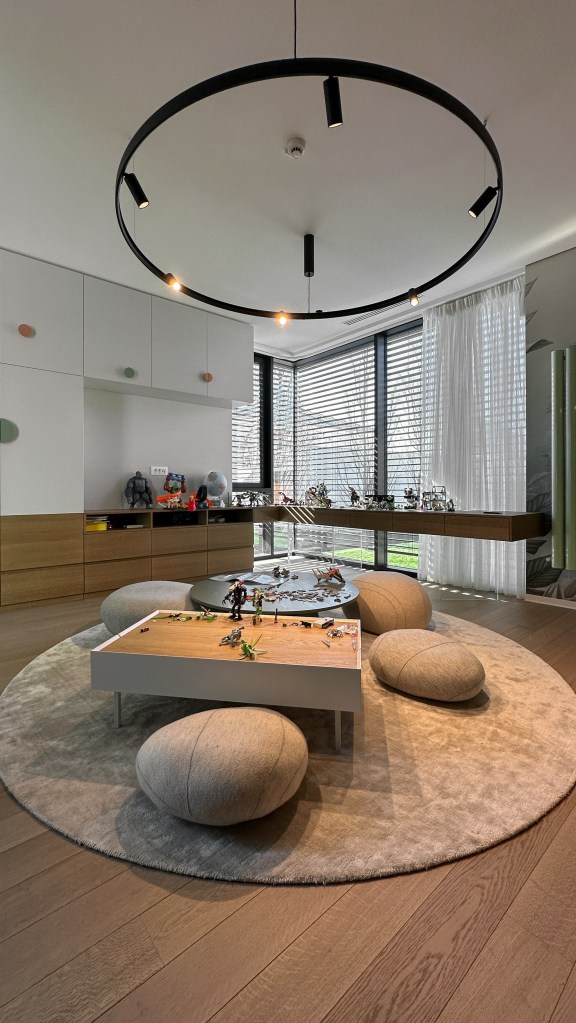 La parter mai există o baie de serviciu și camera de joacă a copiilor, un spațiu ludic, unde au fost folosite accente colorate și elemente de design prietenoase, care contribuie la crearea unui ambient familiar. Depozitările sunt închise pentru un decor aerisit și bine organizat. Centrul încăperii este gândit ca un mic loc de joacă flexibil, organizat cu mese la nivelul celor mici pentru desenat, colorat, lego și alte activități. Parterul mai găzduiește câteva spații complementare precum dressing-ul generos, ascuns de ușa filomuro, camera tehnică și garajul.