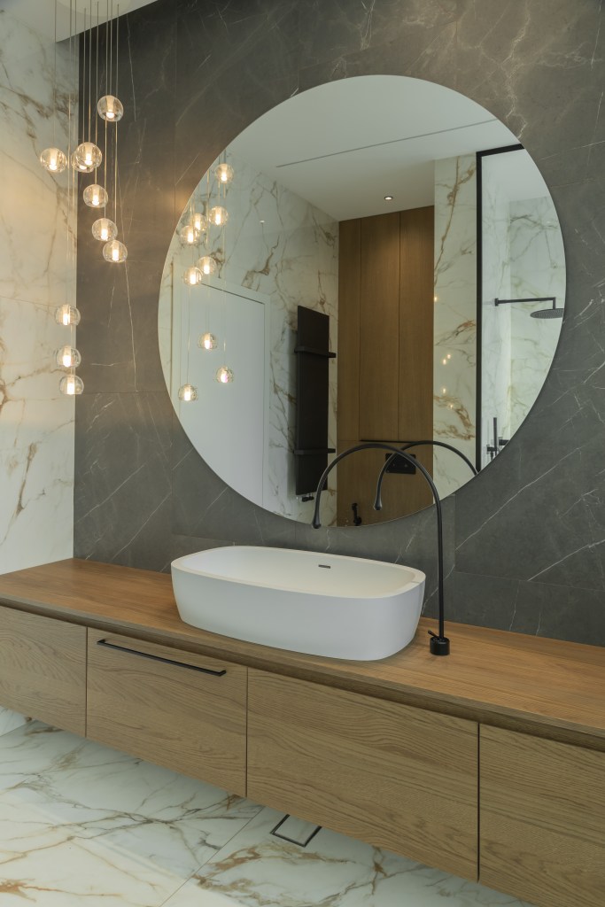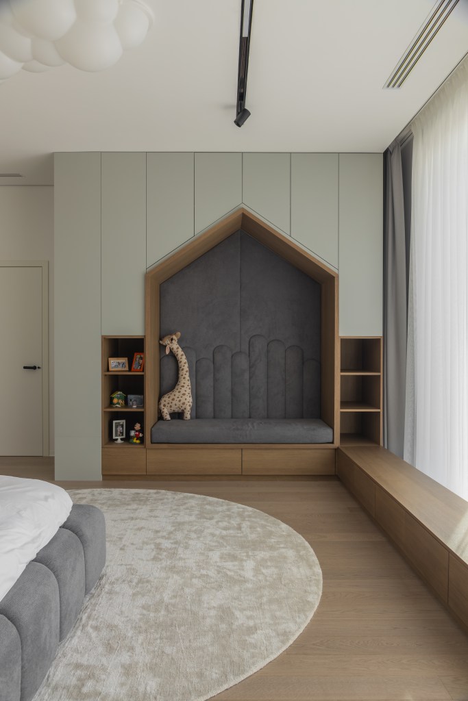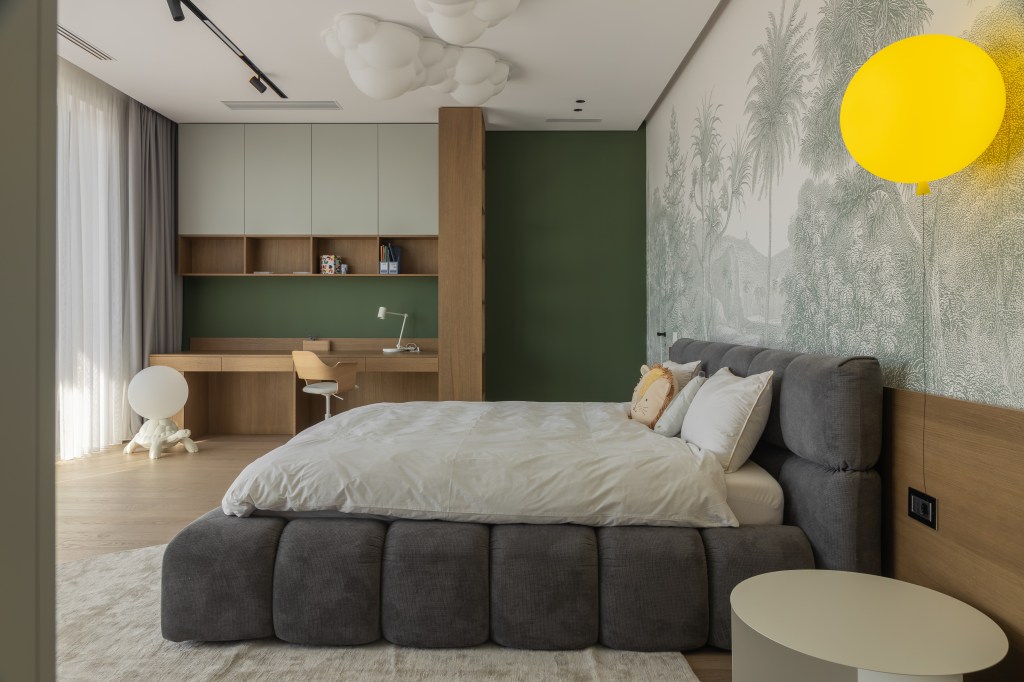Amenajarea dormitorului matrimonial pune mare accent pe confort și relaxare. Toate texturile folosite, paleta cromatică, piesele de mobilier și soluțiile de iluminat sugerează ideea unui spațiu elegant și odihnitor. Verticalitatea este un element ce definește estetica încăperii. Patul, realizat la comandă, are o tăblie atipică ce acoperă întregul perete. Corpurile verticale de iluminat subliniază înălțimea spațiului. Peretele adiacent este îmbrăcat într-un fototapet cu accente aurii, imaginea stilizată a unui soare și zborul păsărilor. Soarele este dublat ca element rotund prin oglinda de dimensiuni mari și banda LED pe contur. Băile fiecarui dormitor sunt realizate cu elemente și culori ce continuă atmosfera camerelor și răspund nevoilor fiecărui membru.