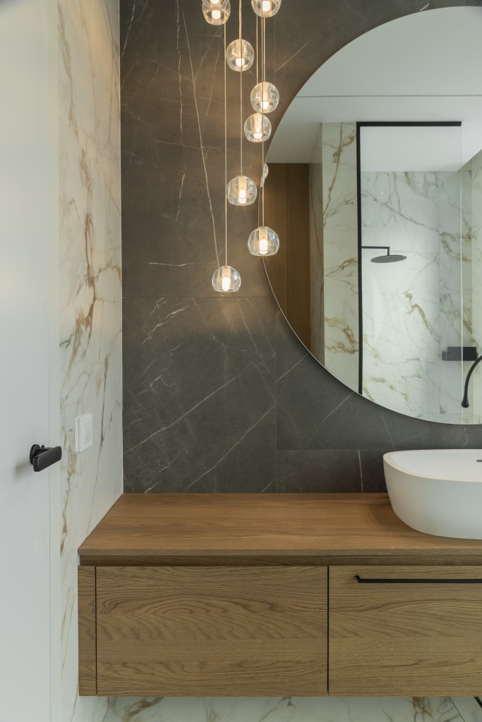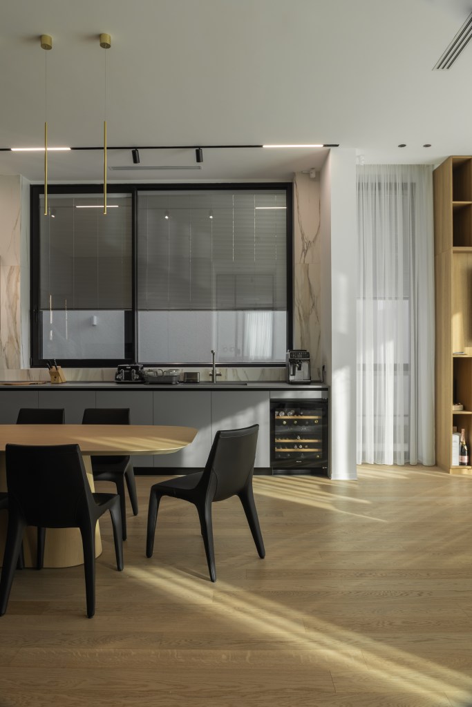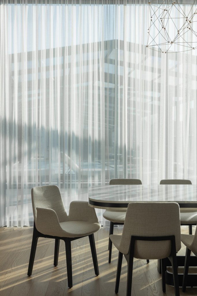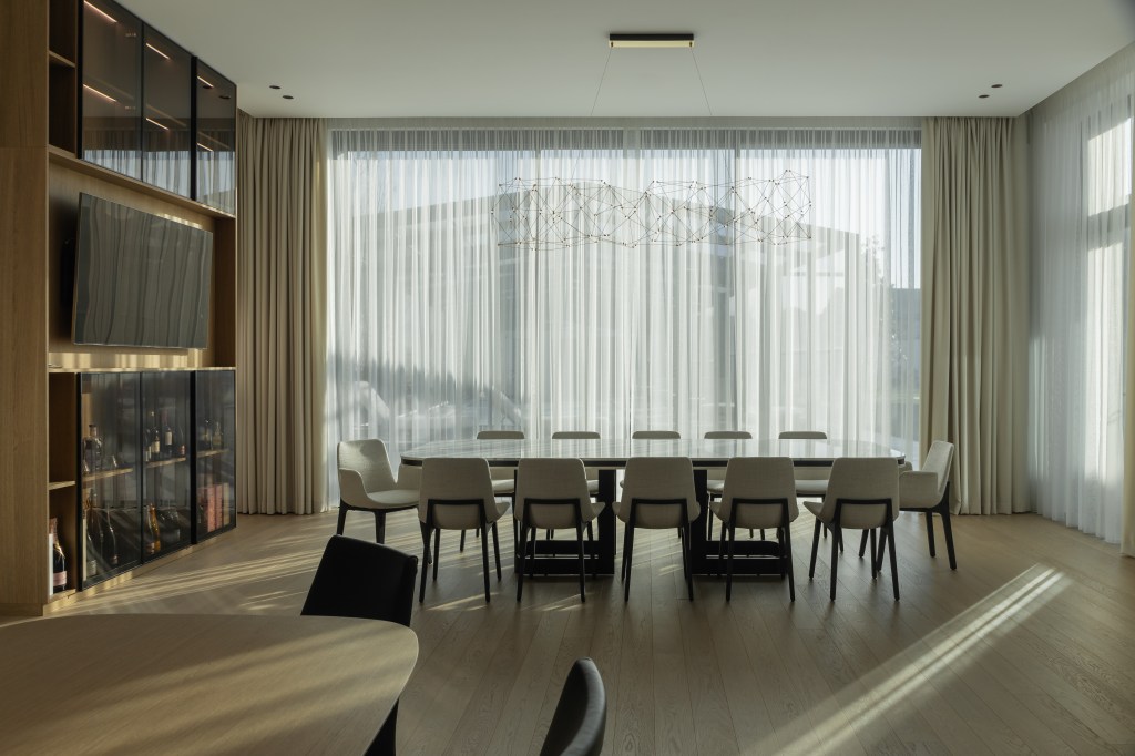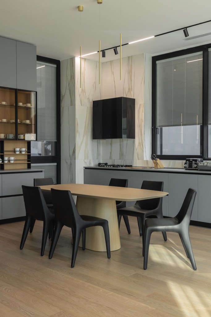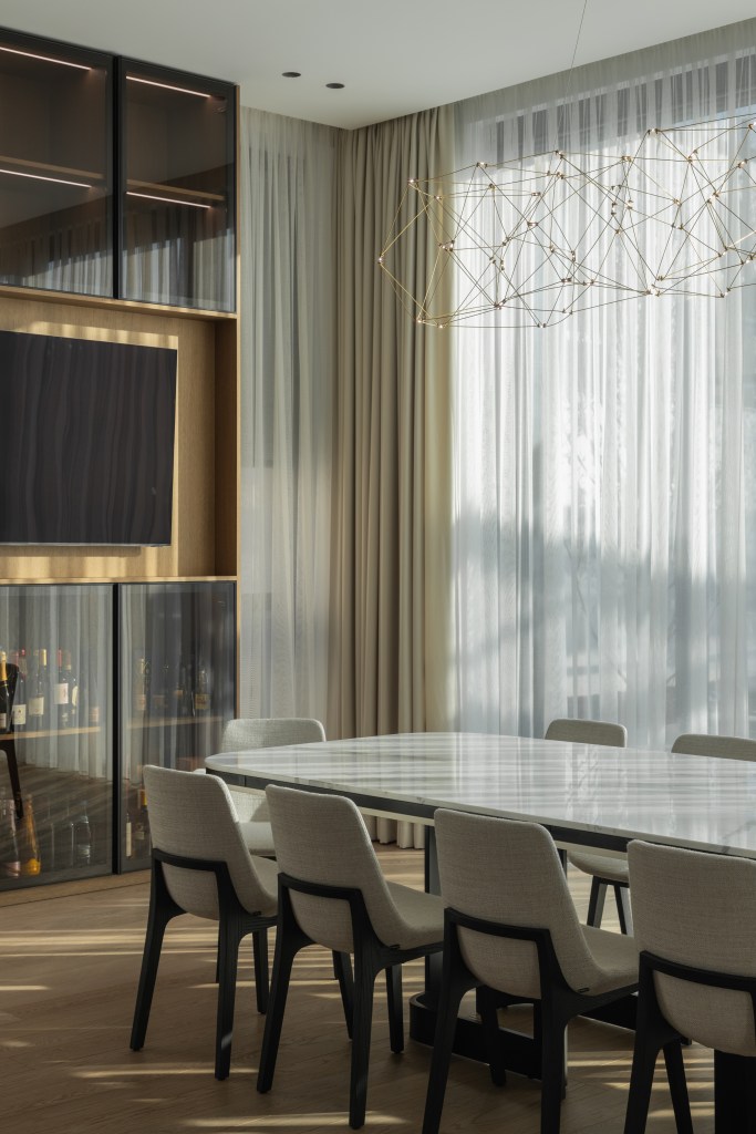 Zona de dining este gândită pentru familia extinsă sau pentru cinele în compania prietenilor. Vedeta acestui spațiu este masa cu blat de marmură, care a fost realizat dintr-o singură bucată și care a complicat foarte mult transportul piesei. Imaginea elegantă a zonei de dining este completată de prezența delicată a corpului de iluminat de la Quasar, Cosmos, ce luminează decorativ prin mici becuri led.