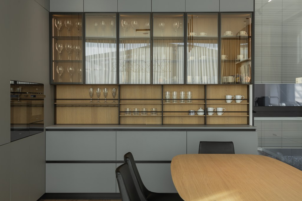 Bucătăria și diningul alcătuiesc un spațiu comun. Ferestrele generoase asigură cantitate mare de lumină naturală și vedere către piscină. În bucătărie, beneficiarii au insistat pentru alegerea unor materiale rezistente și ușor de întreținut în timp. Materialul blatului de lucru, de exemplu, are proprietăți de autoregenerare. Liniile mobilierului, cromatica și texturile continuă estetica livingului. Bucătăria are și o zonă dedicată pentru mesele în familie. Masa folosită aici este din lemn, cu un picior central care îi conferă stabilitate și prezență vizuală.
