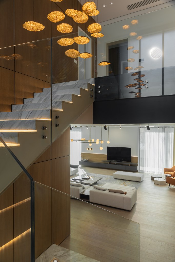 Stilul de amenajare este unul contemporan, cu linii simple și accent pus pe confort. Predomină materialele naturale precum lemnul, marmura sau alama. În ceea ce privește cromatica interiorului, arhitecții de la 2.1 au optat pentru nuanțe neutre și pete de culoare, integrate discret pentru mai multă dinamică. Piesele de mobilier sunt unele „statement”, cu volumetrii ample, potrivite spațiului extins. În afară de texturi și culori, amenajarea este pusă în evidență de soluțiile de iluminat, fie că este vorba de iluminatul ambiental, folosit pentru a accentua anumite zone din casă, fie că este vorba de corpuri de iluminat cu o estetică surprinzătoare.