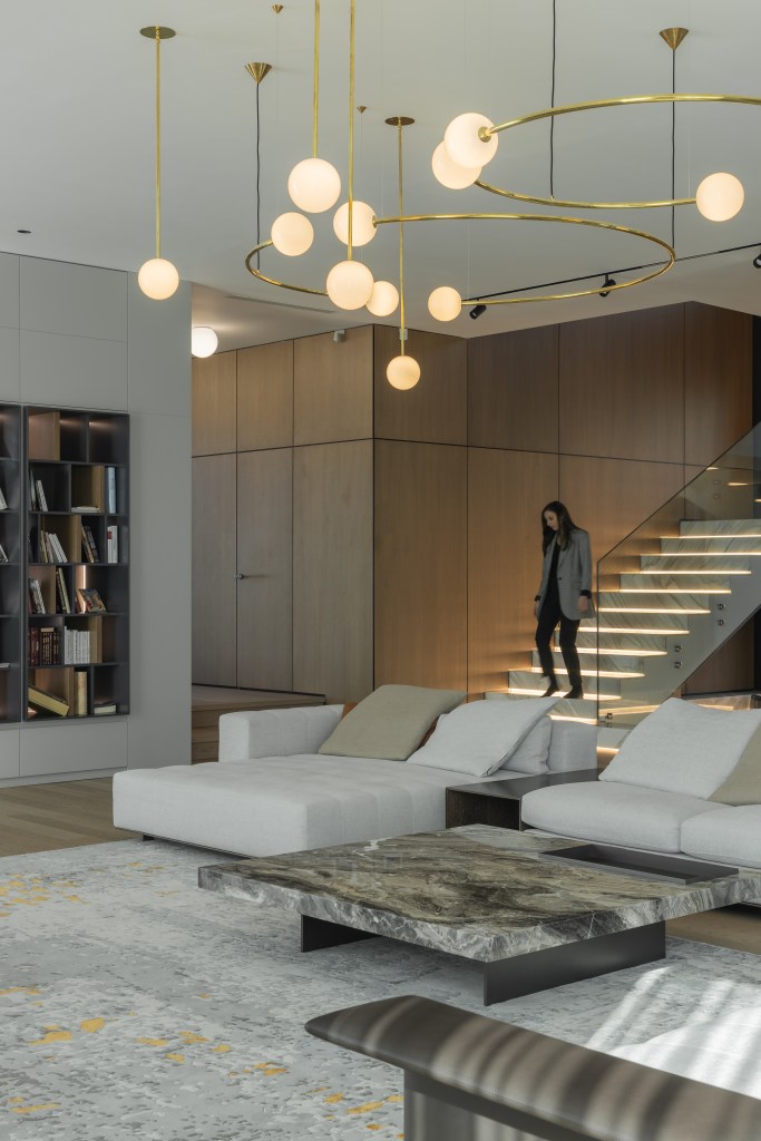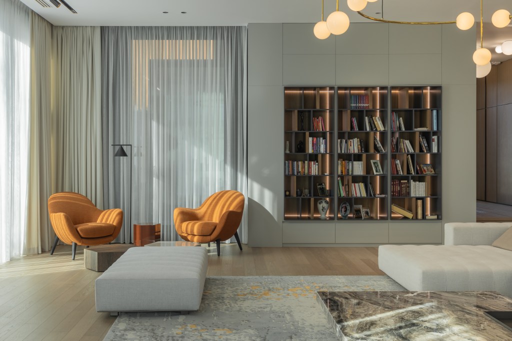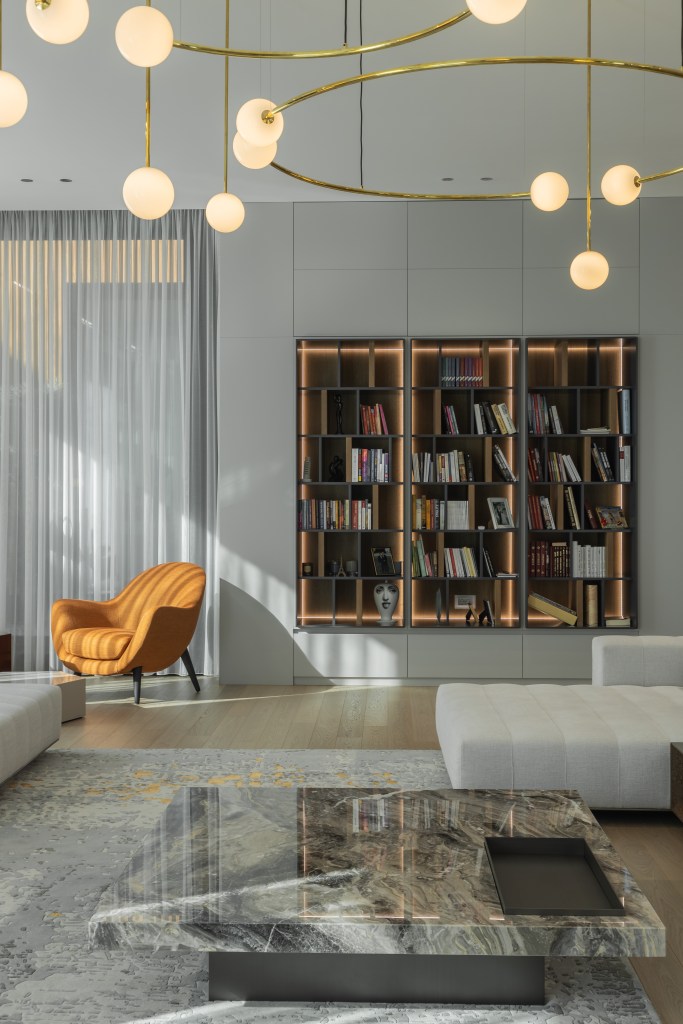 Nucleul locuinței este livingul, o încăpere cu ferestre mari ce dau spre curtea interioară. Pentru a satisface nevoia de confort a beneficiarilor, arhitecții de la 2.1 au folosit o configurație de module de canapea, de la Minotti, care să se plieze pe dimensiunile generoase ale spațiului. Măsuța de cafea este, la rândul ei, o piesă supradimensionată care completează decorul. În living mai există o bibliotecă înaltă până în tavan, care alternează depozitarea închisă cu soluții estetice de display. Accentul de culoare, în acest spațiu cu cromatică neutră, este dat de cele două fotolii portocalii de la Poliform. Dialogul texturilor și alegerea corpurilor de iluminat cântăresc și ele mult în imaginea obținută.