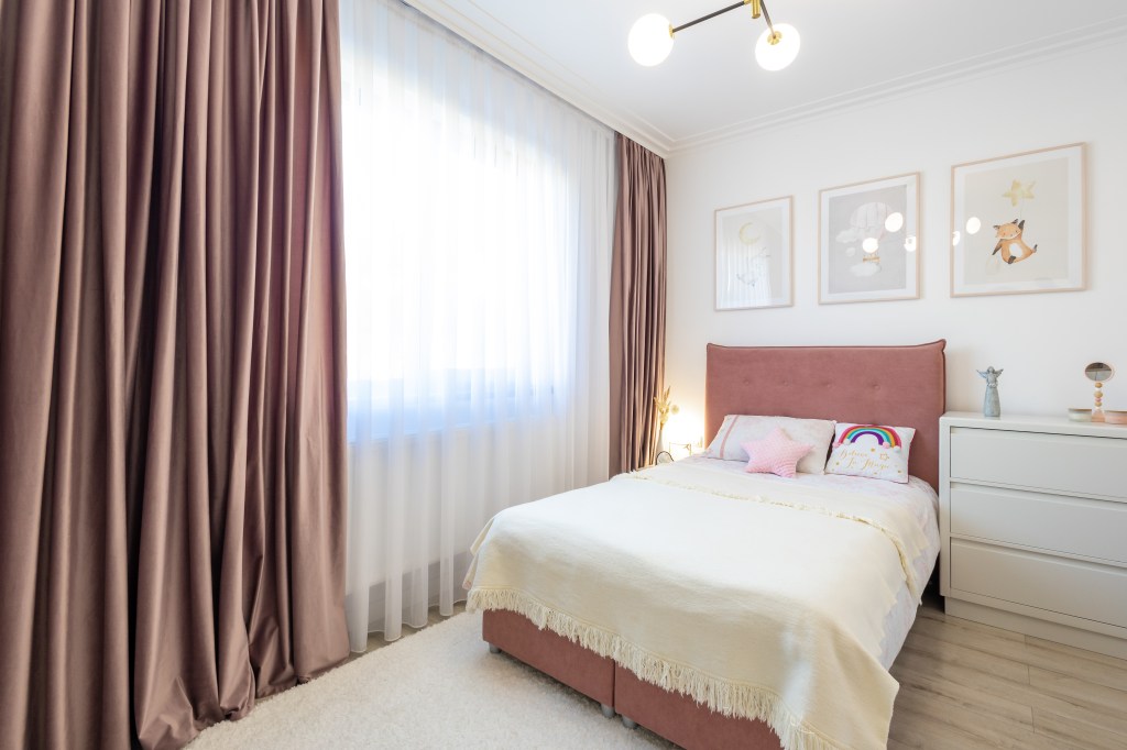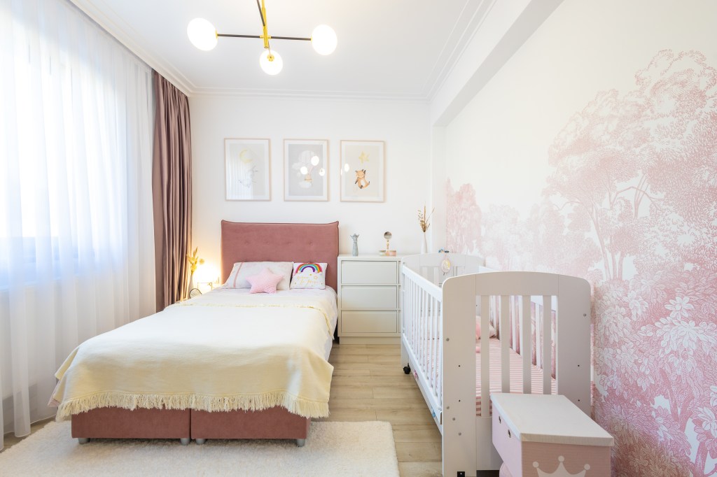 Camera fetiței are tema naturii, cu tapet în tonuri pastelate și nuanțe de roz pudrat, folosite cu moderație, ca accent. Mobilierul este conceput pentru a fi atât practic, cât și jucăuș, oferind suficient spațiu de depozitare și un mediu plin de imaginație pentru micul locuitor al camerei. Accentele de culoare și obiectele de decor, în culori asortate cu tapetul, completează atmosfera primitoare și prietenoasă a camerei.
