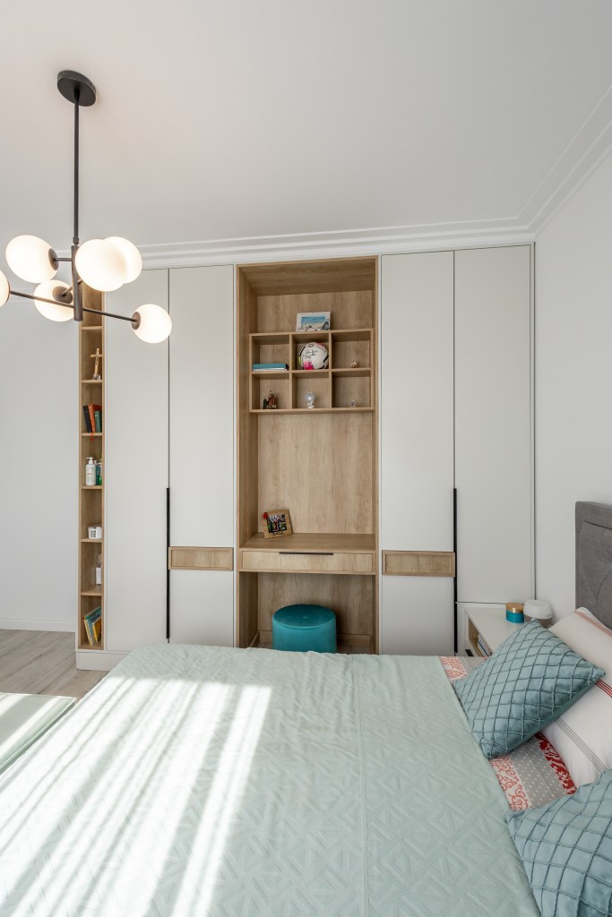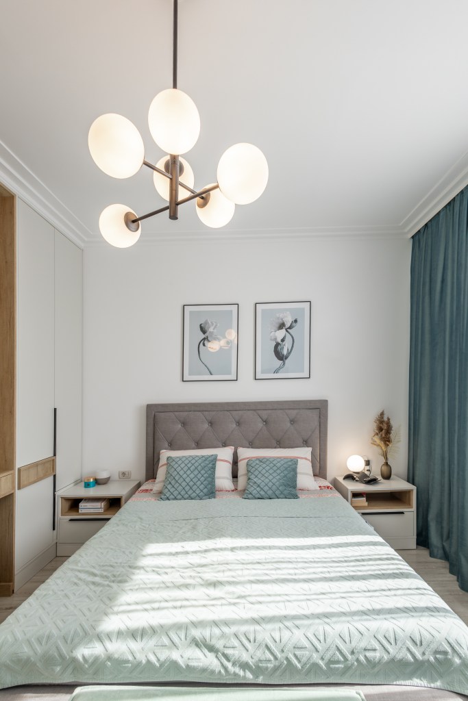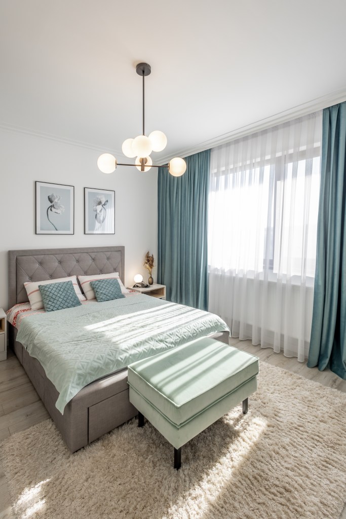 „Dormitorul matrimonial este un sanctuar al luminii și al liniștii”, spune Vlad. „Albul peretilor creează un fundal calm și spațios, în timp ce accentele de culoare verde mentă adaugă prospețime și vitalitate în încăpere. Această culoare vibrantă este integrată subtil prin intermediul banchetei, a draperiilor și a pernelor decorative, aducând un plus de energie și optimism. Mobilierul este ales cu atenție, fiind elegant și funcțional, oferind un spațiu organizat și plăcut pentru odihnă”.