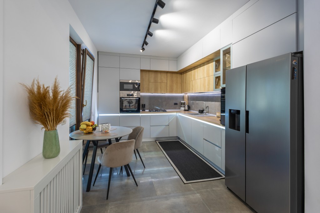 Designerii au reușit să eficientizeze fiecare metru pătrat disponibil cu ajutorul mobilierului făcut pe comandă. Ca să păstreze aspectul organizat al încăperii, au optat pentru dulapuri fără mânere, electrocasnice incorporabile și depozitări închise. Mobilierul gri deschis, cu finisaj lucios reflectă lumina naturală, dând senzația unui spațiu mai generos. Sistemul de iluminat cu LED-uri reușește, la rândul lui, să creeze o atmosferă caldă și primitoare într-una dintre cele mai folosite încăperi ale casei. Lângă fereastră, beneficiarii și-au dorit un mic dining pentru utilizare zilnică, lăsând masa din living pentru momentele în care au prieteni în vizită.