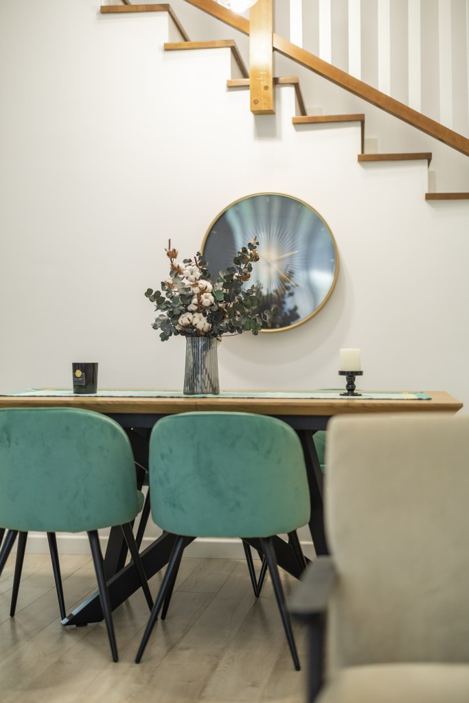 „Este o încăpere adaptată vieții de familie”, explică designerul Vlad Eva. „Am delimitat funcțiunile spațiului prin poziționarea pieselor de mobilier. Avem un mic dining, lângă casa scării, pus în evidență de un candelabru elegant. În zona de relaxare, am avut grijă să optăm pentru mobilier confortabil. Din punct de vedere cromatic, am apelat la nuanțe neutre ca să obținem acea atmosferă cozy, dorită de beneficiari. Am integrat și o pată de culoare, prin alegerea scaunelor de catifea verde”.
