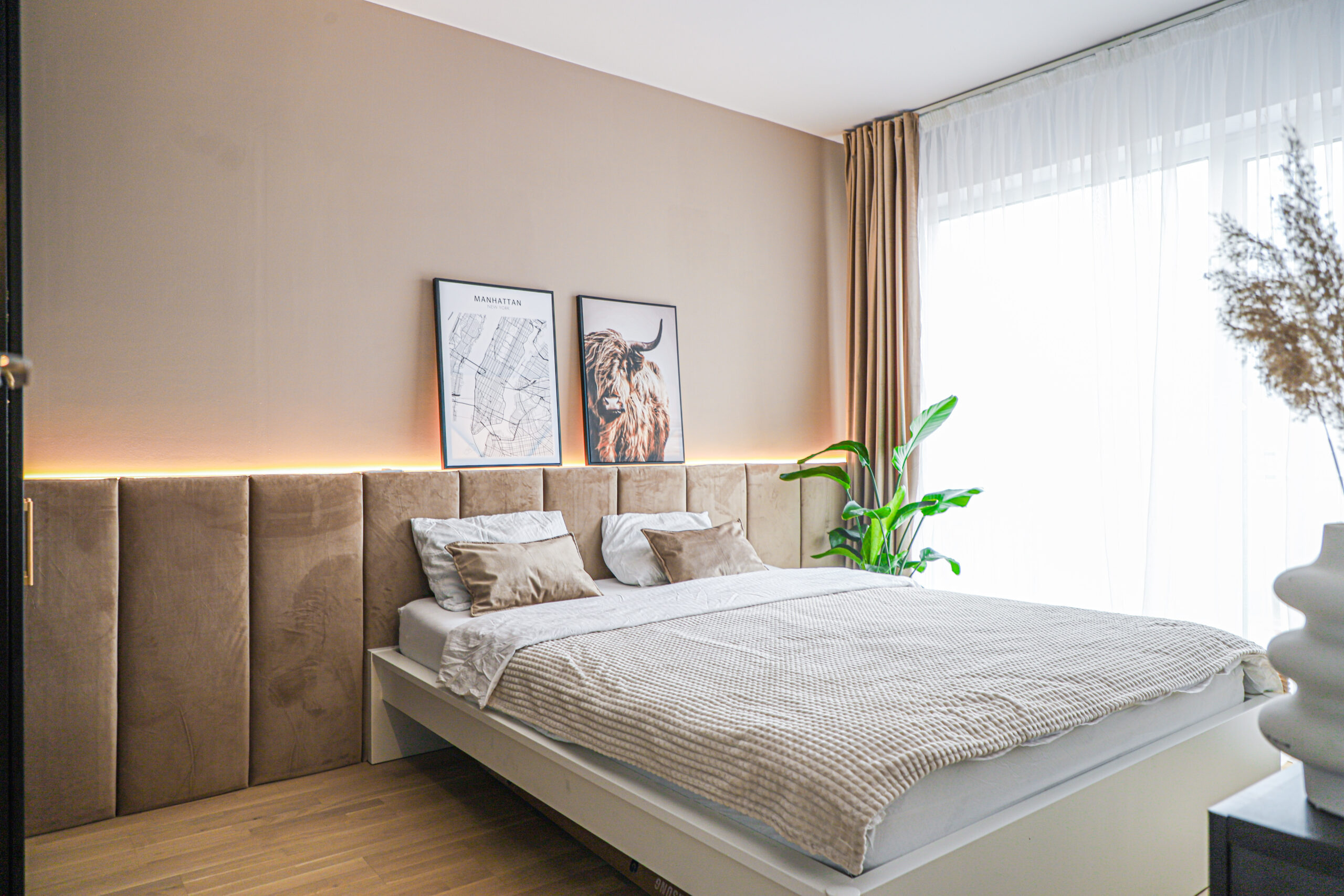 În dormitor, atmosfera cozy este obținută prin cromatică și texturi.