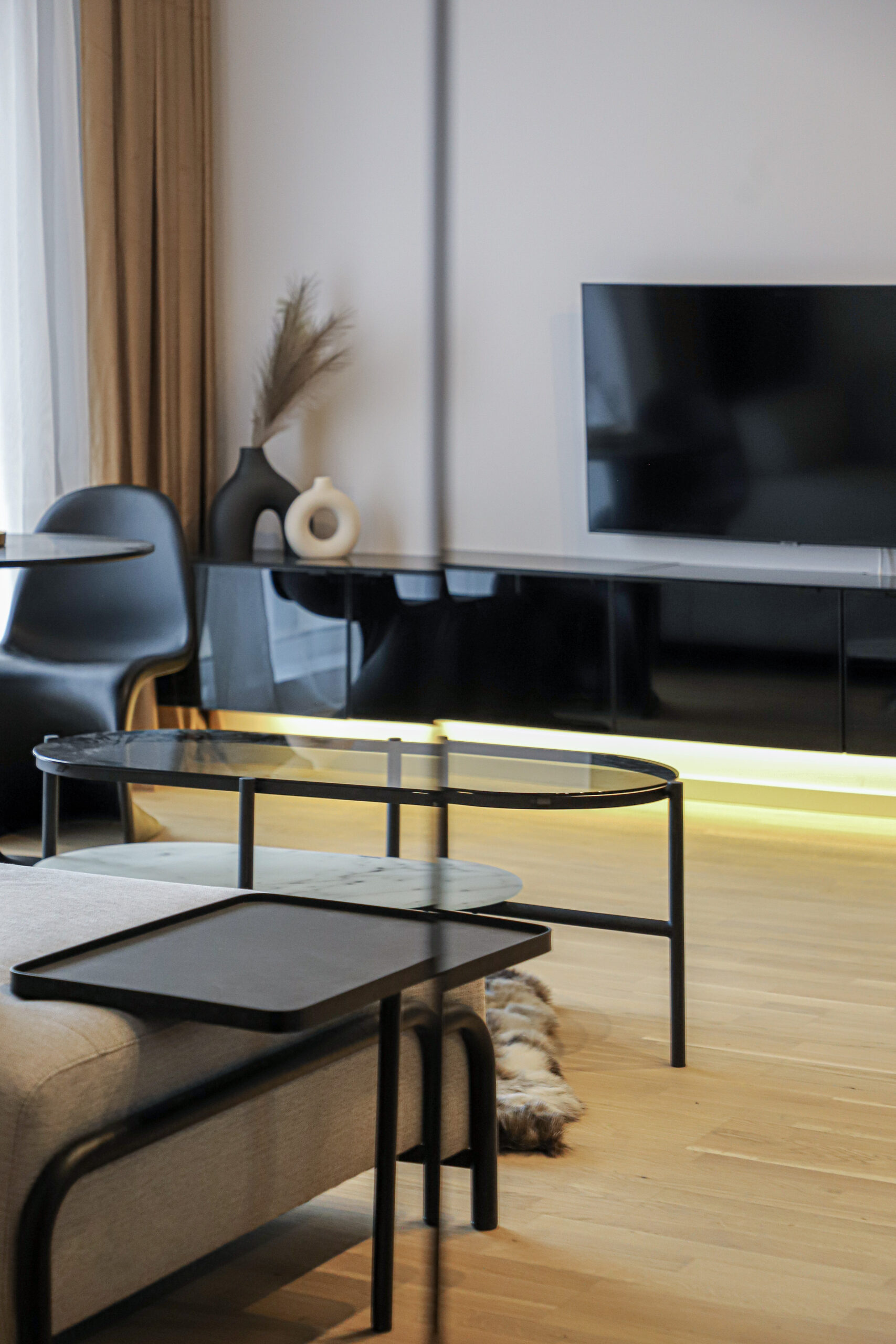 Proiectul urmărește câteva principii simple: culori neutre care reflectă lumina naturală, oglinzi și suprafețe lucioase pentru profunzime și mobilier suspendat sau cu picioare care creează impresia de spațiu în plus. Ajută mult și lumina naturală, unul dintre principalele atuuri ale apartamentului. În zona de zi, mobilierul este predominant negru. În bucătărie, corpurile au finisaj mat, în timp ce peretele din dreptul blatului este placat cu oglindă.
