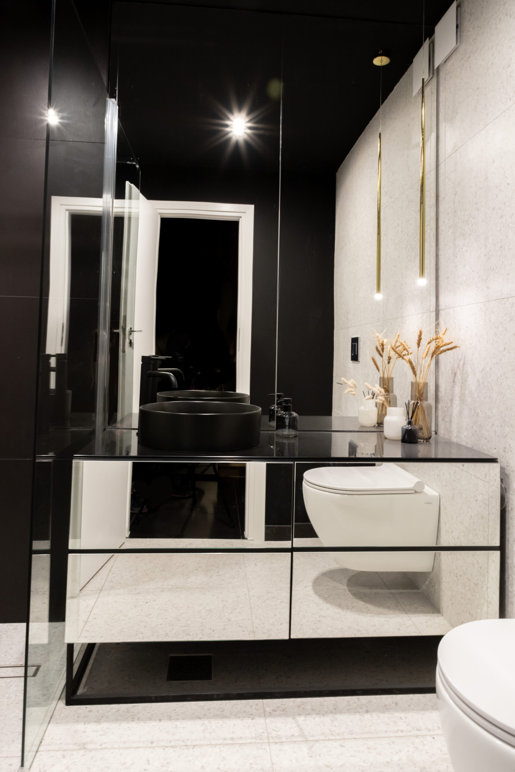 Oana a folosit oglinzile și în baie pentru a crea iluzia de spațiu mai mare. Inclusiv, lavoarul este placat cu oglindă. Negrul este folosit și aici pentru contrast, după aceeași rețetă ca în zona de intrare în apartament, unde tavanul și pereții sunt vopsiți negru intens pentru un efect dramatic.