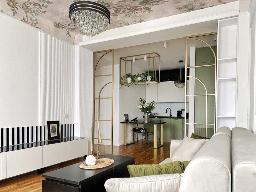 Locuința are o suprafață utilă de aproape 80 metri pătrați. Este alcătuită din bucătărie, living și două dormitoare. Amenajarea este un amestec de elemente moderne și elemente Art Deco, ce fac trimitere la arhitectura clădirii în care se află apartamentul. Ancadramentele metalice care separă bucătăria de living, amintesc de elementele amplasate pe geamurile clădirilor istorice. Soluția nu doar că este una spectaculoasă din punct de vedere estetic, dar ajută ca bucătăria să aibă parte de lumină naturală. Ca să obțină atmosfera boemă dorită de proprietari, arhitecta Ioana Corbu s-a folosit de finisaje și detalii. Sticla și marmura au dat eleganță spațiului. La fel și tapetul, prezent în cele două dormitoare, și în living, la nivelul tavanului.