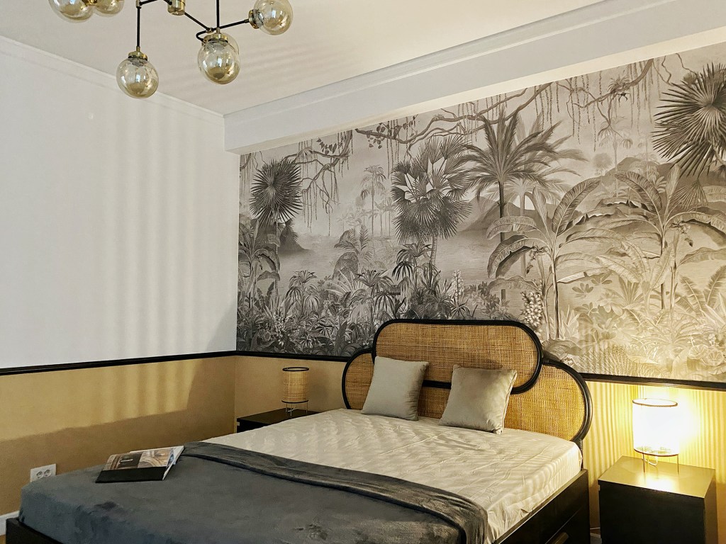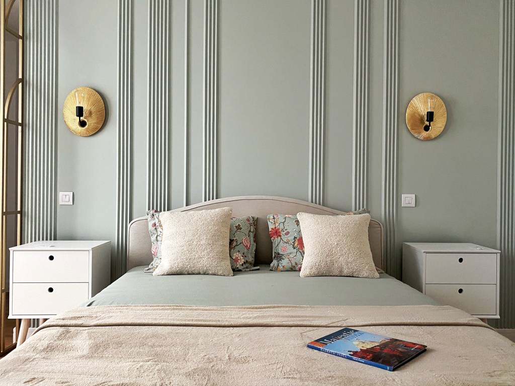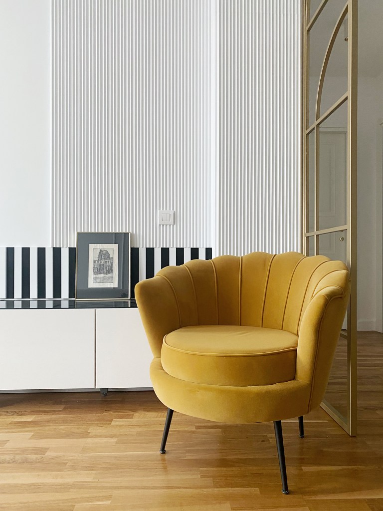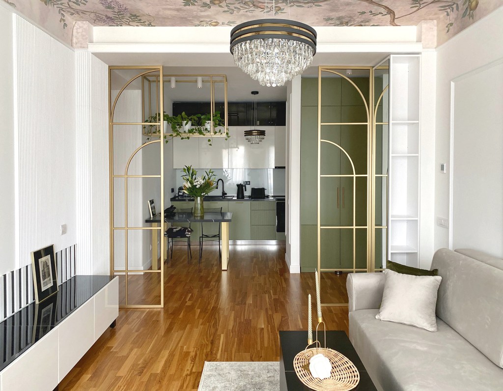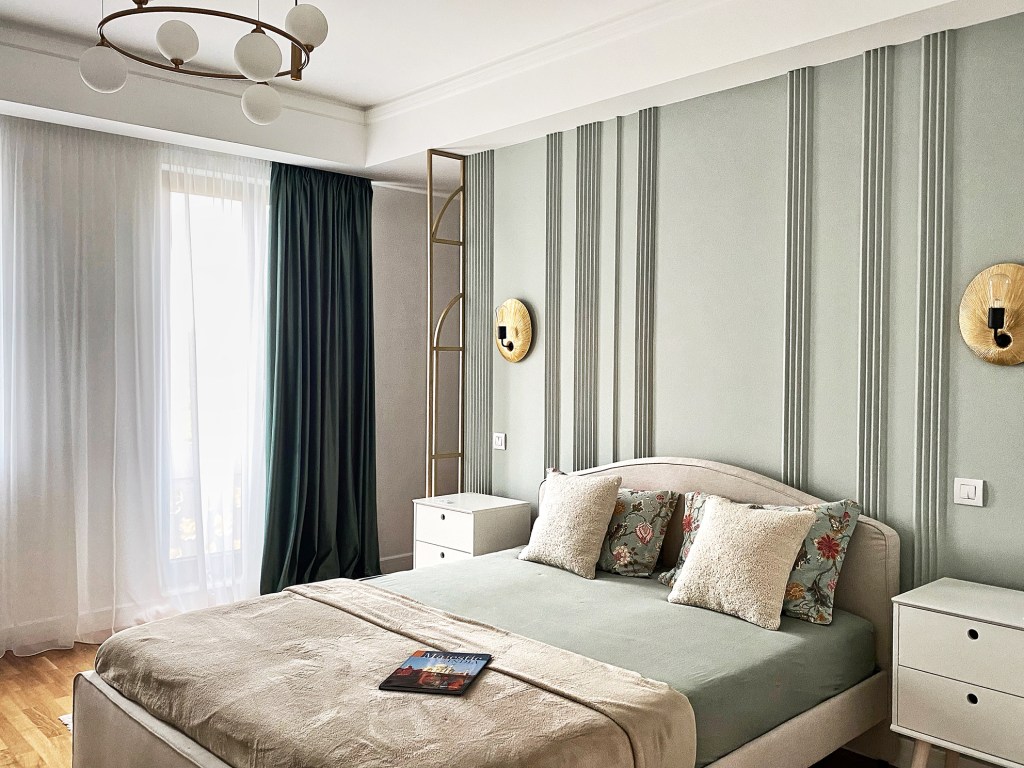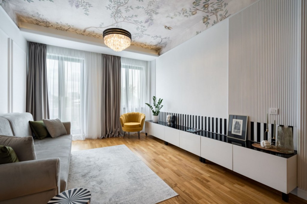 „Apartamentul este amenajat pentru închiriere ulterioară, așa că am pornit de la ideea de a crea un decor luxuriant care să facă trimitere la arhitectura deosebită a clădirii în care se află”, spune arhitecta Ioana Corbu.