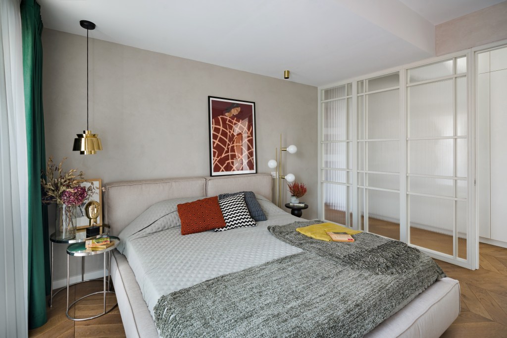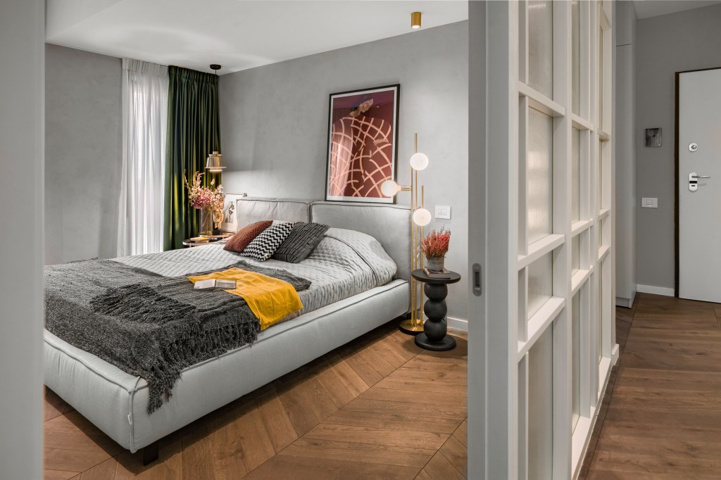 Dormitorul este un spațiu simplu, curat și aerisit. Patul are un design minimalist și este înconjurat de două noptiere negre, elegante pe care sunt așezate două plante naturale în nuanțe roșiatice. Corpurile de iluminat geometrice sunt suspendate din perete și pun astfel în valoare mici detalii din încăpere. Paleta cromatică este predominant neutră și sunt favorizate nuanțele de alb, gri și bej care conferă un aspect calm și ordonat. Draperiile de un verde olive aduc un strop de vitalitate în încăpere.