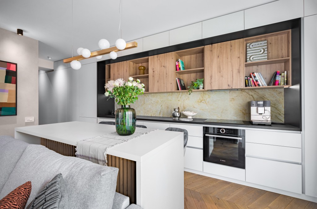 Apartamentul are un punct forte esențial și anume – toate camerele primesc lumină naturală. Holul este cel care face legătura dintre zona de intrare și camera de zi. Astfel, mobilierul de pe hol, unde se regăsesc și spațiile de depozitare, se îmbină perfect cu mobilierul din bucătărie acolo unde a fost încorporat și frigiderul.