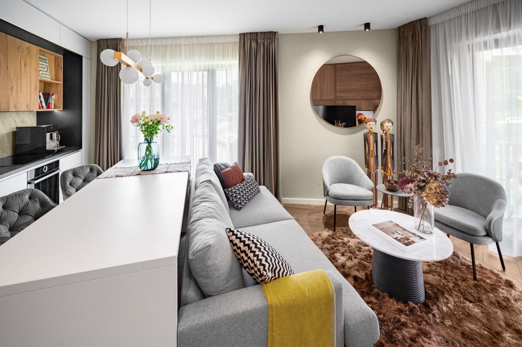 Camera de zi combinată cu bucătăria a devenit un spațiu deschis care emană căldură și confort. Mobilierul este aranjat într-un mod funcțional și estetic, cu un colț primitor pentru relaxare format dintr-o canapea confortabilă și două fotolii. Acestea sunt înconjurate de mai multe perne colorate, care adaugă un strop de personalitate.