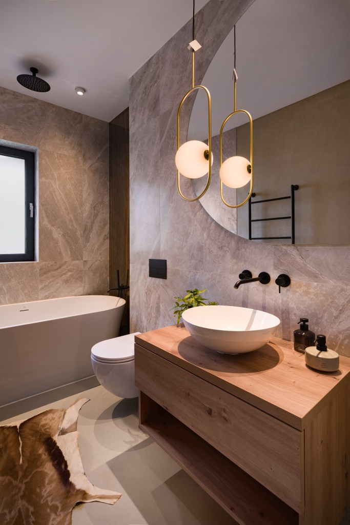 În baie pereții sunt acoperiți cu plăci ceramice în tonuri de gri deschis. Mobilierul din lemn cu o finisare naturală conferă un aspect organic și cald. Oglinda mare suspendată pe perete reflectă lumina și creează iluzia de spațiu, iar cele două lustre suspendate din tavan vin cu un design minimalist și linii curate. Ele oferă o lumină caldă, uniformă, care pun în valoare detaliile din baie.