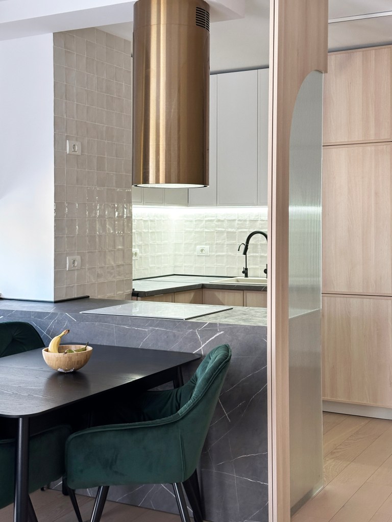Zona de zi are un plan relativ deschis și beneficiază de multă lumină naturală, unul dintre punctele forte ale apartamentului. Principala provocare a fost delimitarea clară între bucătărie și living, fără a pierde senzația de spațiu aerisit.