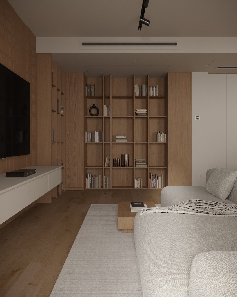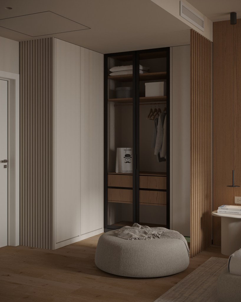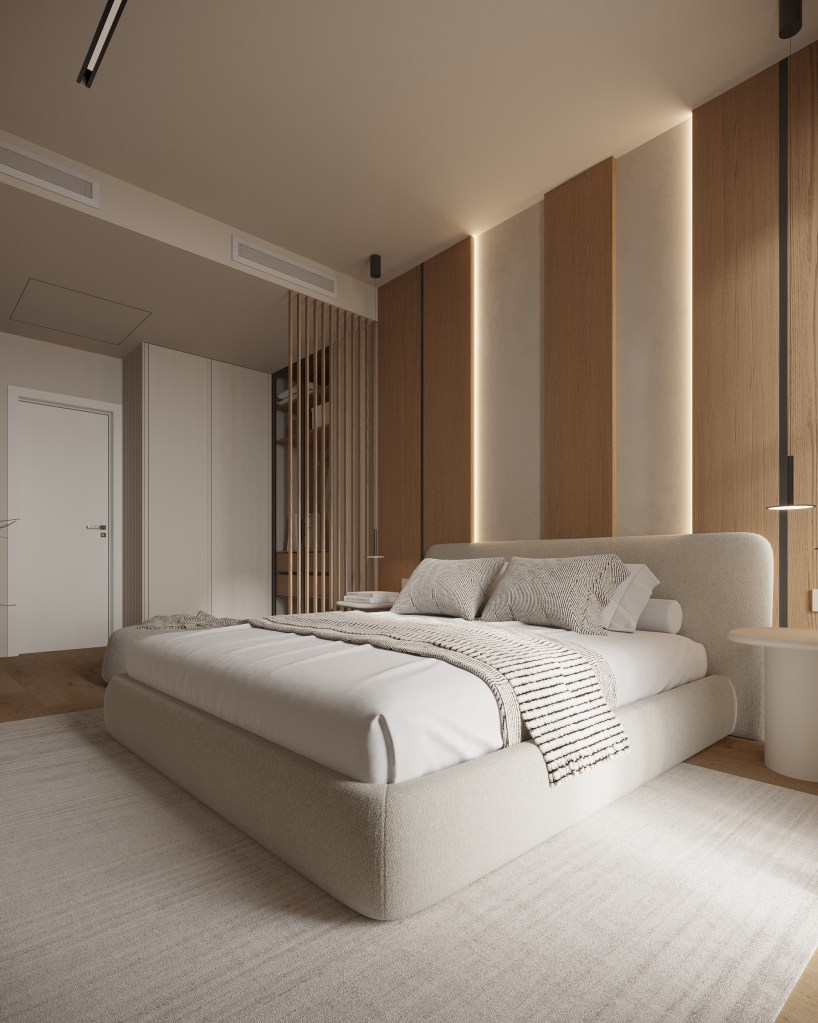 Intrarea în dormitorul matrimonial e printr-un dressing care face legătura directă cu baia matrimonială. Amenajarea urmărește ideea de calm și retragere, motiv pentru care beneficiarii au ales să renunțe la televizorul clasic în favoarea unui videoproiector. O soluție discretă și versatilă, care păstrează pereții liberi. Mobilierul e realizat pe comandă, iar materialele și cromatica rămân în aceeași linie cu restul apartamentului, cu lemn natural și finisaje mate care adaugă căldură.