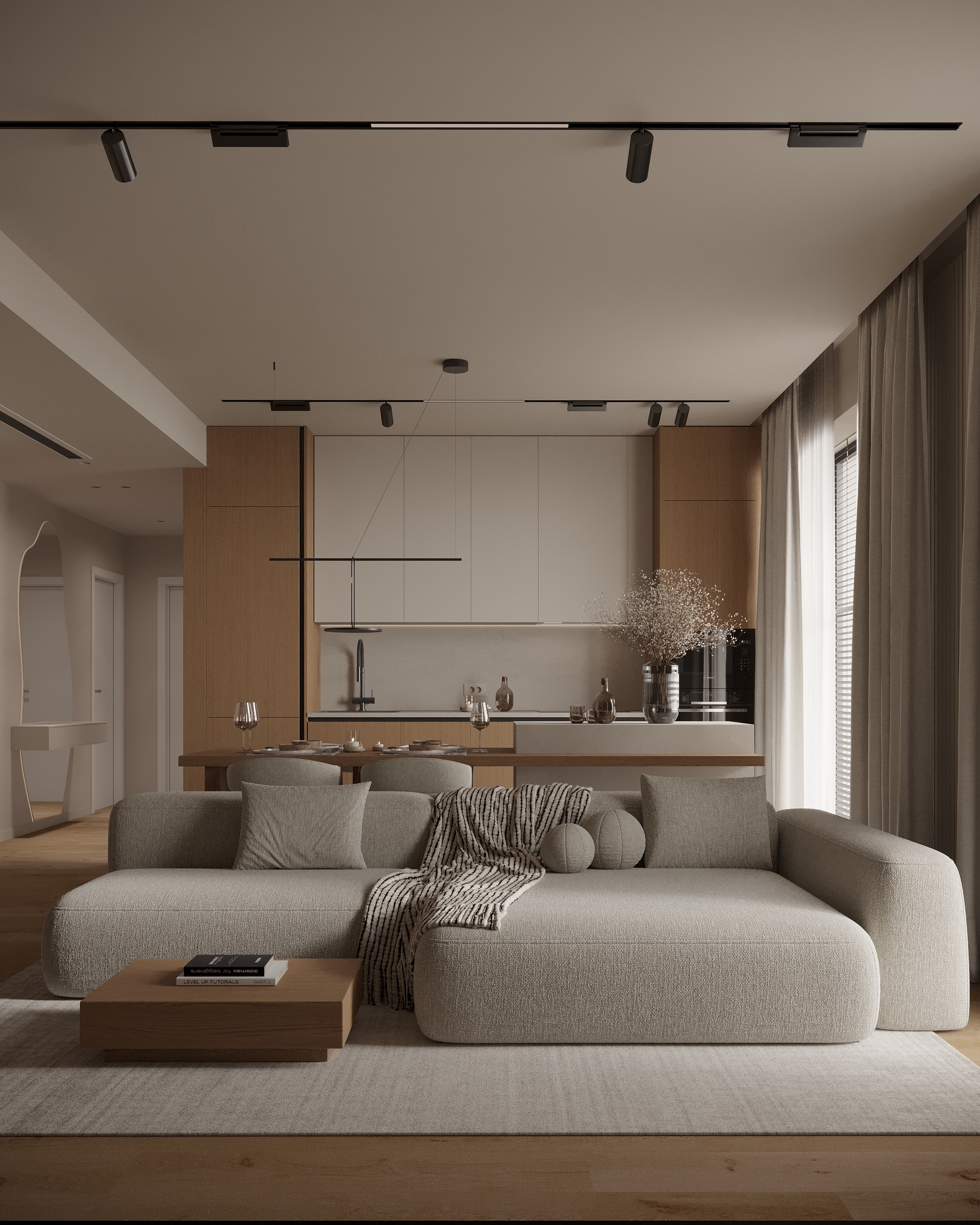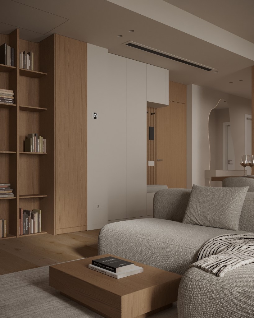 Zona de zi este organizată ca un open space care reunește livingul, bucătăria și diningul. Paleta cromatică mizează pe nuanțe de bej, crem și tonuri calde de lemn, completate de texturi mate și suprafețe ușor texturate. Canapeaua modulară, una dintre investițiile importante ale proiectului, definește zona și leagă încăperea.