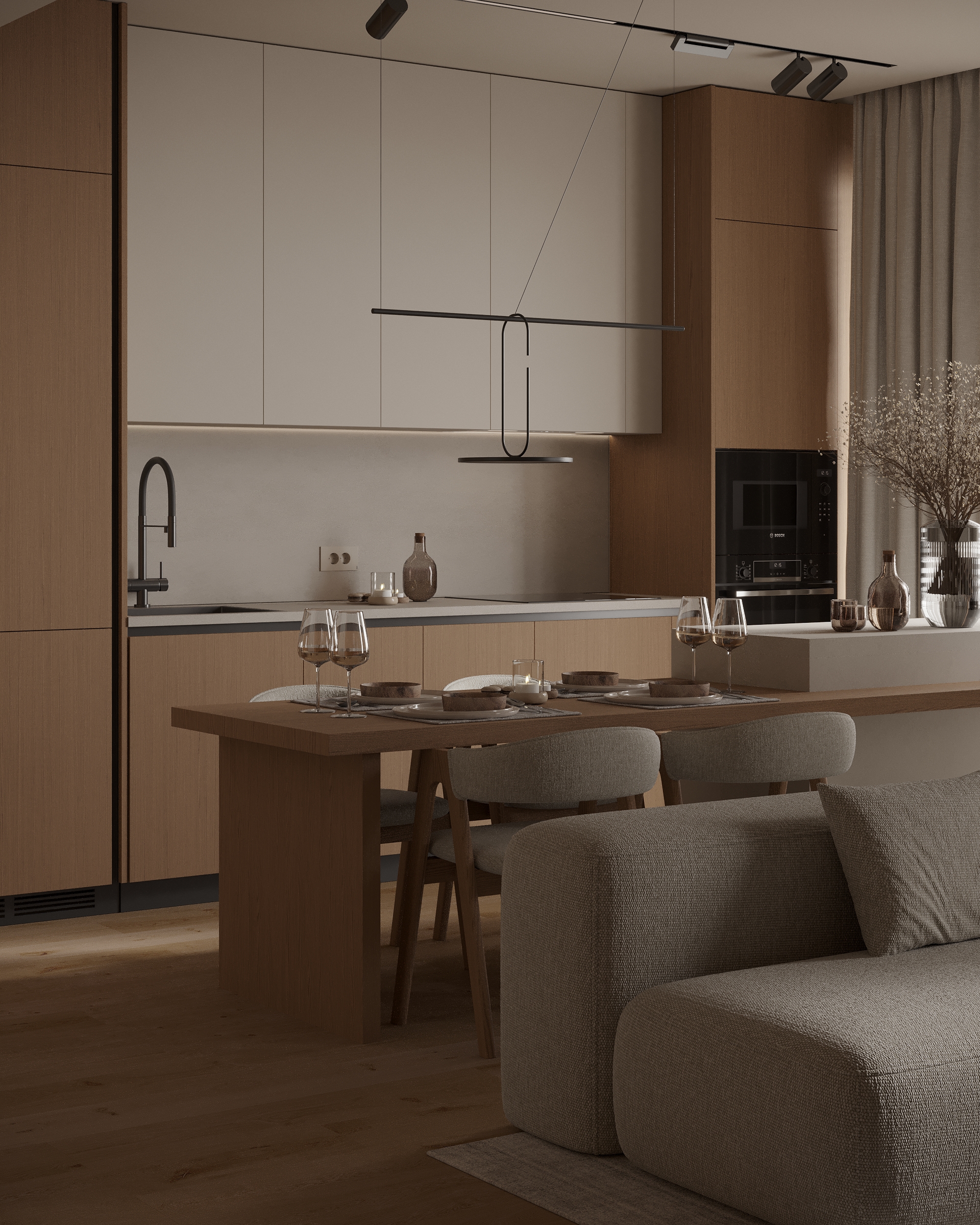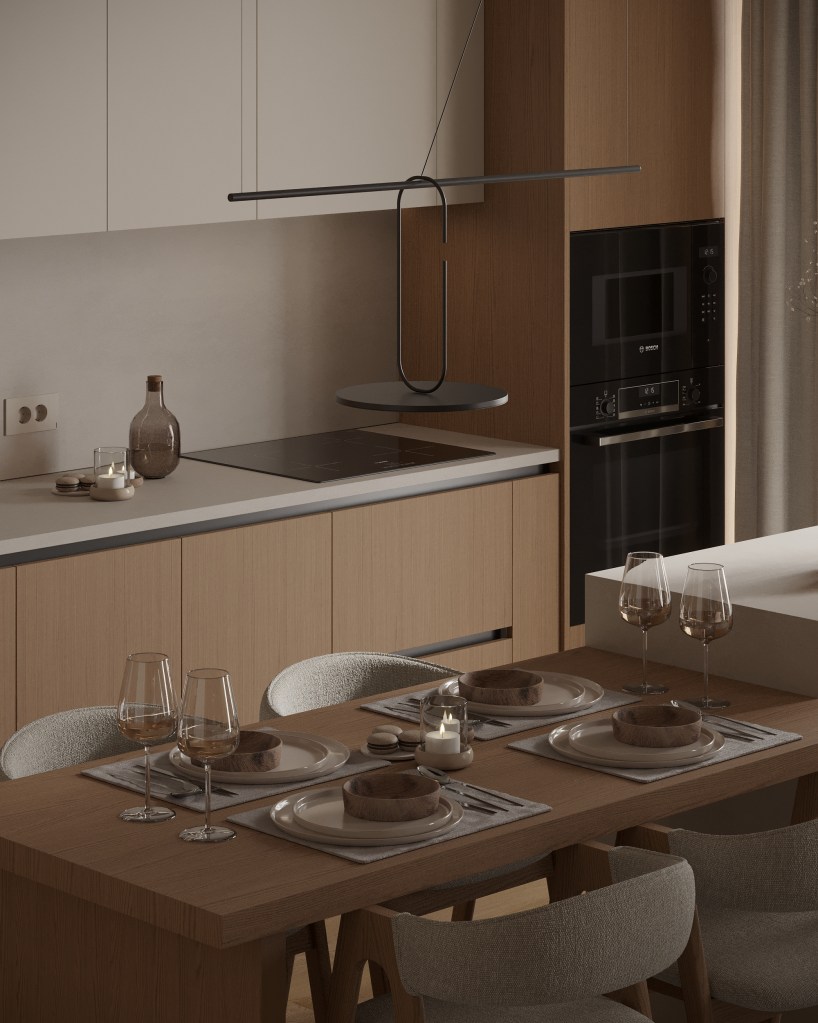 Bucătăria se dezvoltă în jurul unei insule multifuncționale, care înlocuiește masa clasică de dining. Soluția propusă de designeri combină zona de lucru cu o extensie de masă, oferind loc pentru patru persoane. Insula devine astfel un punct central al locuinței, potrivit atât pentru mese rapide, cât și pentru momente petrecute cu prietenii.