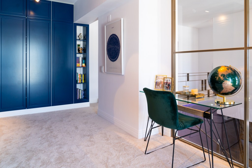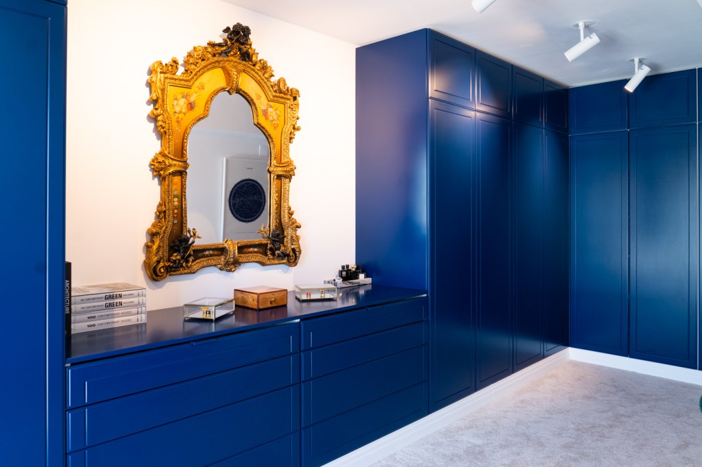 Camera de dressing comunică cu dormitorul și zona de zi prin peretele vitrat, ce i-a luat locul peretelui din zidărie. Aici, mobilierul este lucrat la comandă din MDF albastru. Piesa de rezistență a camerei este oglinda veche, cu ramă aurie, cumpărată la licitație de Matei. Tot aici, a fost amenajată și o mică zonă de birou, compusă din masă de studiu, scaun și un glob pământesc, cadoul Laviniei pentru Matei cu ocazia zilei sale de naștere. „Iubim călătoriile, iar acest glob pământesc transmite perfect pasiunea noastră comună. Am ales un model verde, pentru a-l asorta cu scaunul de birou”, spune Lavinia.