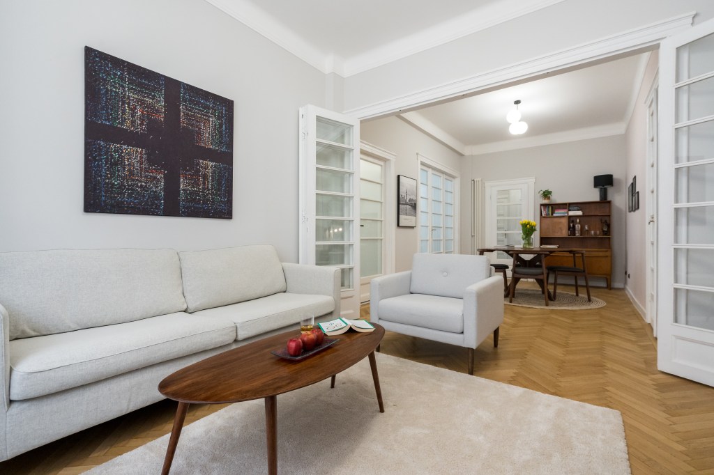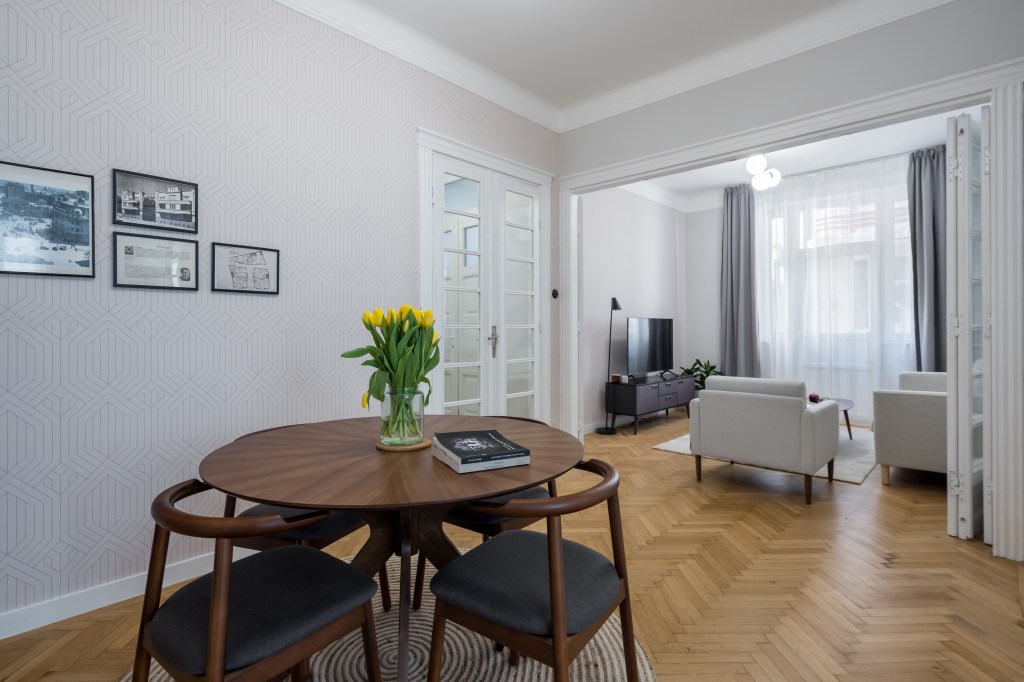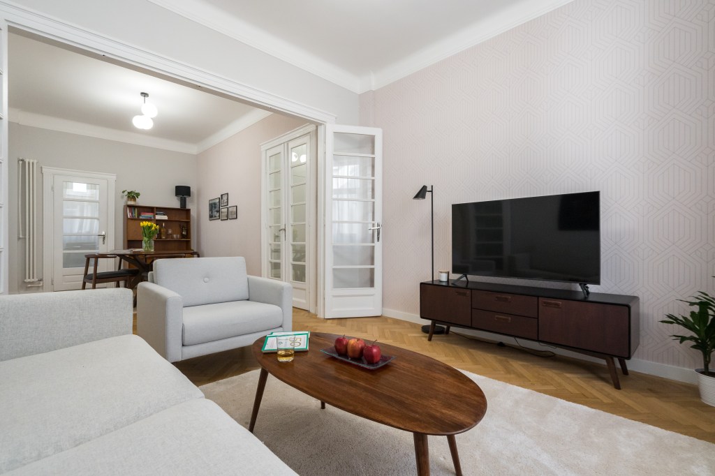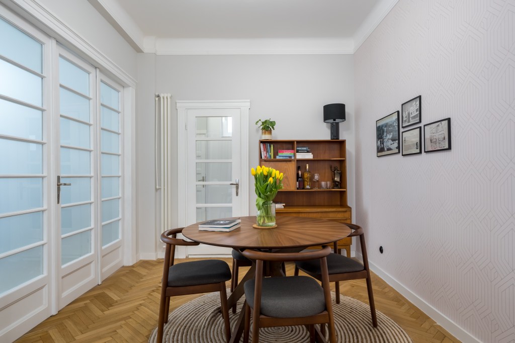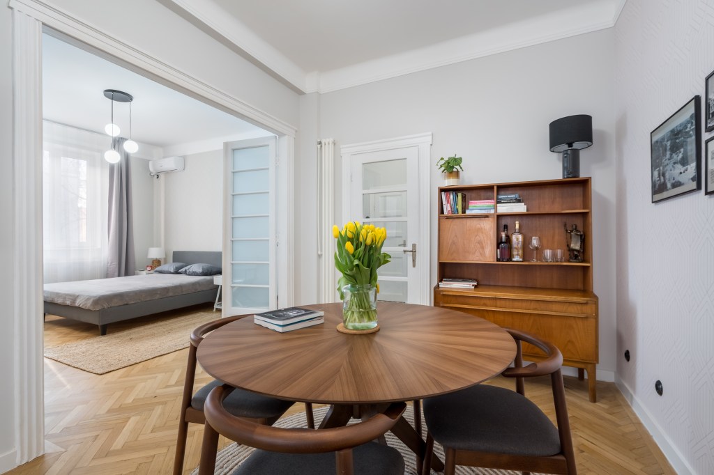 Proprietarul unui apartament situat într-o clădire interbelică din zona bulevardului Dacia din Capitală a făcut echipă cu designerul Ionuț Gherasim de la Massura Studio pentru a reda interiorului farmecul de altădată. Locuința, cu tavane înalte și compartimentare atipică, a devenit un airbnb cochet și luminos, la finalul unui șantier care a durat, cu pauze, zece luni și a presupus o investiție de 30.000 euro.