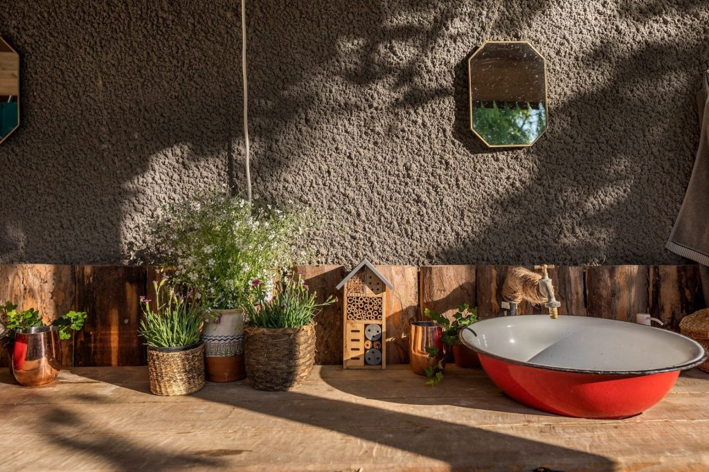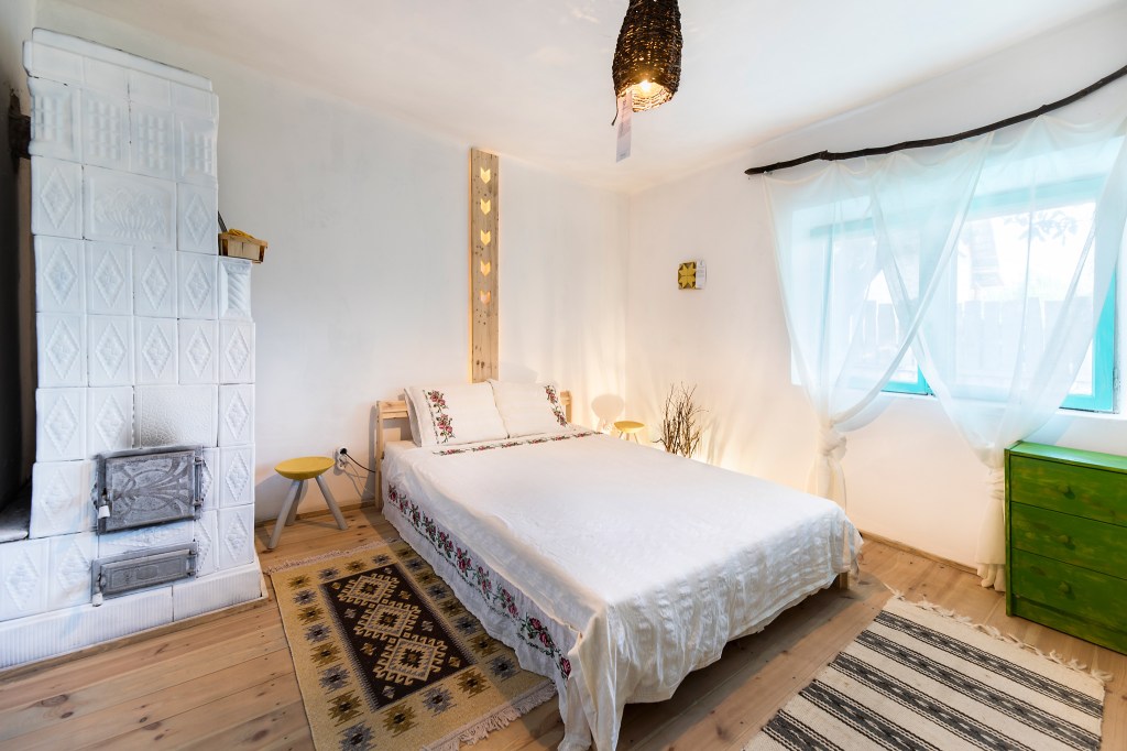 Bineînțeles că cei doi au adus și elemente noi, din contemporan, care să completeze spațiul cu un confort al zilelor noastre. Chiar și acestea, ca de exemplu canapelele și mesele din paleți sau piscina, reușesc să se integreze natural în cadru. Cât despre utilități, acestea există într-o măsură mulțumitoare pentru viața la țară: au apă curentă din sat și din puțul propriu, iar încălzirea este electrică sau cu sobe pe lemne (cu mențiunea că satul are în plan și rețeaua de gaze).