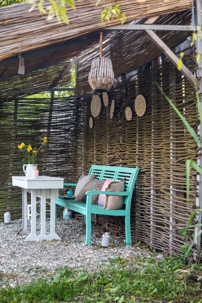 Colțul preferat: Fiecare are colțul său preferat – Alex este fan al „băncuței” din lemn vechi cu logo-ul RURAL turnat în rășină epoxi, de culoare turcoaz, și care are trei spătare. Unul mai mic (pentru băiețelul nostru, Martin), unul mediu (Diana) și unul mai înalt (Alex). Eu prefer „zona de citit”, adică un pat de afară, reconstituit din două cadre de pat vechi pe care le-am găsit în podul casei, pat căruia îi fac umbră o căpiță de fân și un brad foarte înalt.