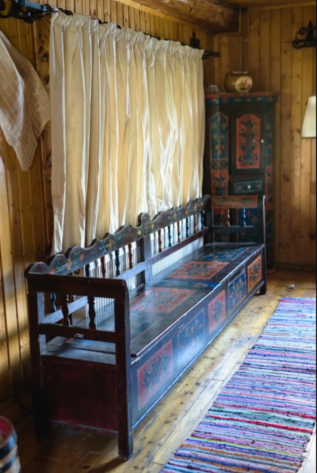 Colțul preferat: Preferatul meu este fotoliul de lângă șemineu. Iarna e minunat pentru citit la lumina focului, iar dacă te uiți în dreapta ta, vezi terasa cu priveliște spre Piatra Craiului. Lângă el este așezat lădoiul săsesc și un dulăpior de colț, în același stil. Ești înconjurat de geamuri mari, prin care te încălzește și soarele.