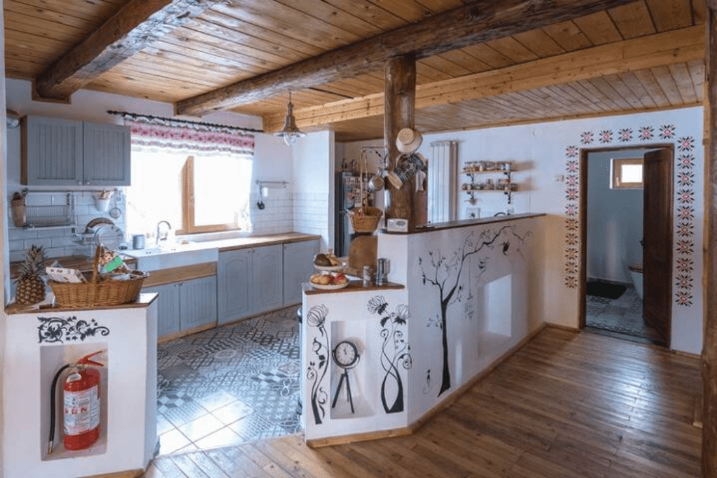 Din fosta configurație au mai rămas doar pereții și fundația, care e făcută din piatră de rău. În rest, au modificat totul, de la băi, bucătărie și până la exterior. Dar au păstrat și au refolosit grinzile de lemn din casă și pereții din lemn stil rândunică, vechi de cel puțin 100 de ani.