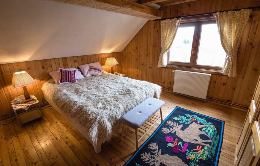 Cum arată acum această locuință? Casa are un beci cu o cameră tehnică, parterul cu bucătăria, livingul, o baie și o cameră, iar la etaj sunt restul camerelor (în total sunt șase), fiecare cu baie proprie. Mansarda înseamnă mini apartamentul proprietarilor, unde cei doi au compartimentat spațiul inteligent, astfel încât să poată amenaja dormitorului băiețelului lor, dormitorul matrimonial cu vedere spre Piatra Craiului și o baie. Au refăcut, bineînțeles, și terasa, care fusese lăsată în paragină și era putrezită, un balcon și prispa din fața casei, care erau în același stadiu.