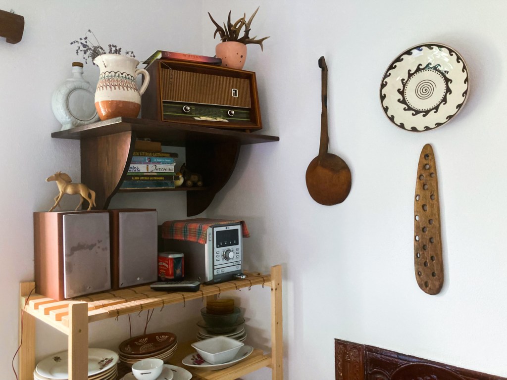 Ce n-am folosit ca atare (scaune, mese, paturi) am reinventat ca piese de mobilier sau le-am gîndit ca obiecte de decor: am pus oglinzi ferestrelor, dintr-un teasc am făcut o băncuță, am folosit trușiile ca noptiere, unei tejghele pentru brînză i-am pus mînere și astfel a devenit o lădiță pentru audio-books, am pus suporți unei jumătăți de fund de butoi și l-am transformat în raft, am folosit brîhle ca galerie de perdele, sucale în chip de lădițe pentru plicurile cu condimente.