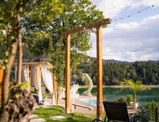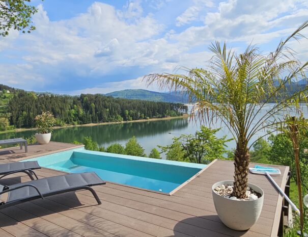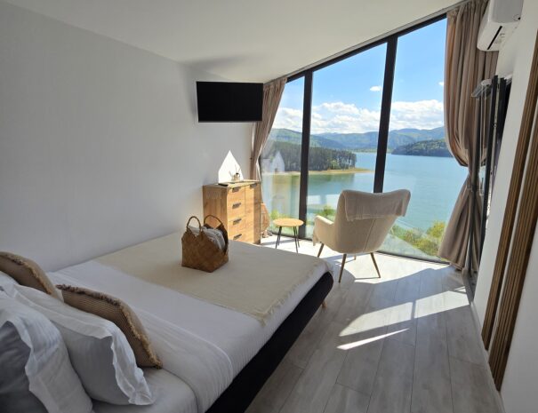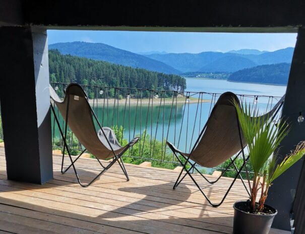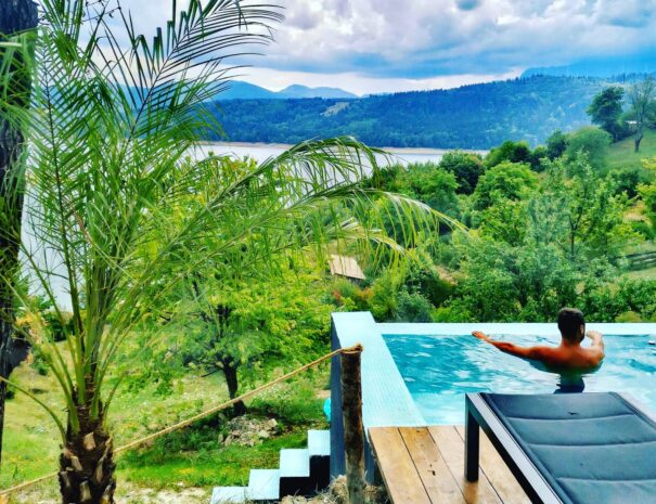 Relaxare în piscină și panoramă asupra lacului Bicaz