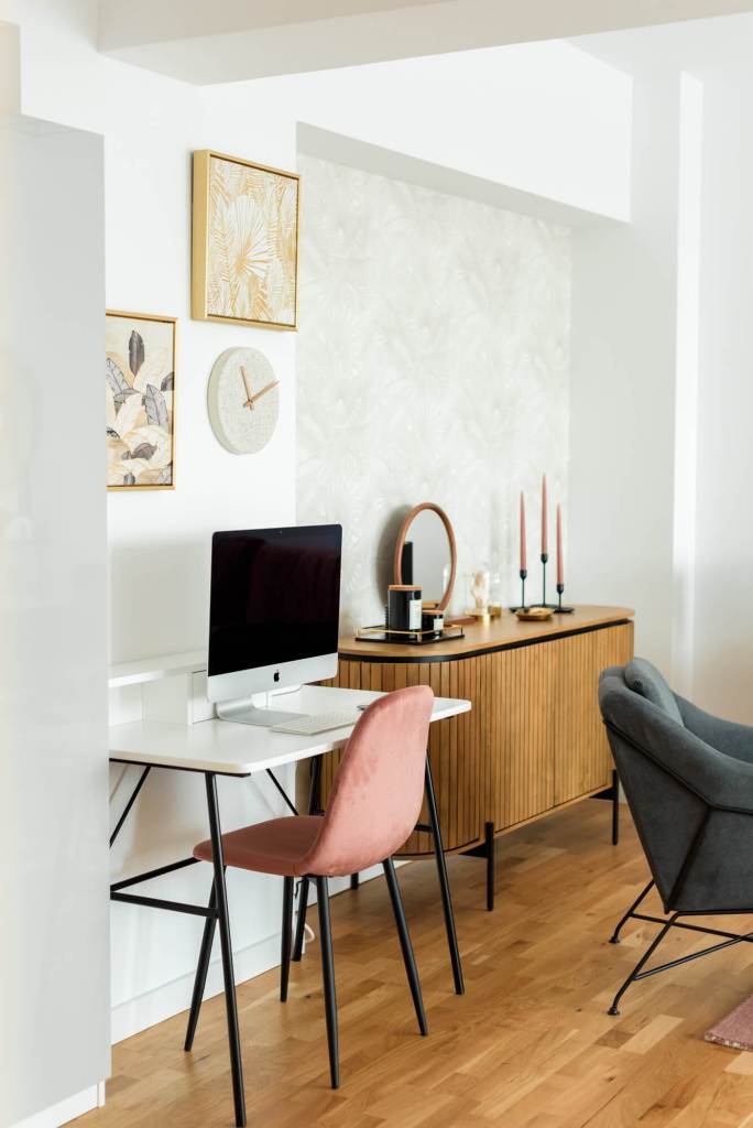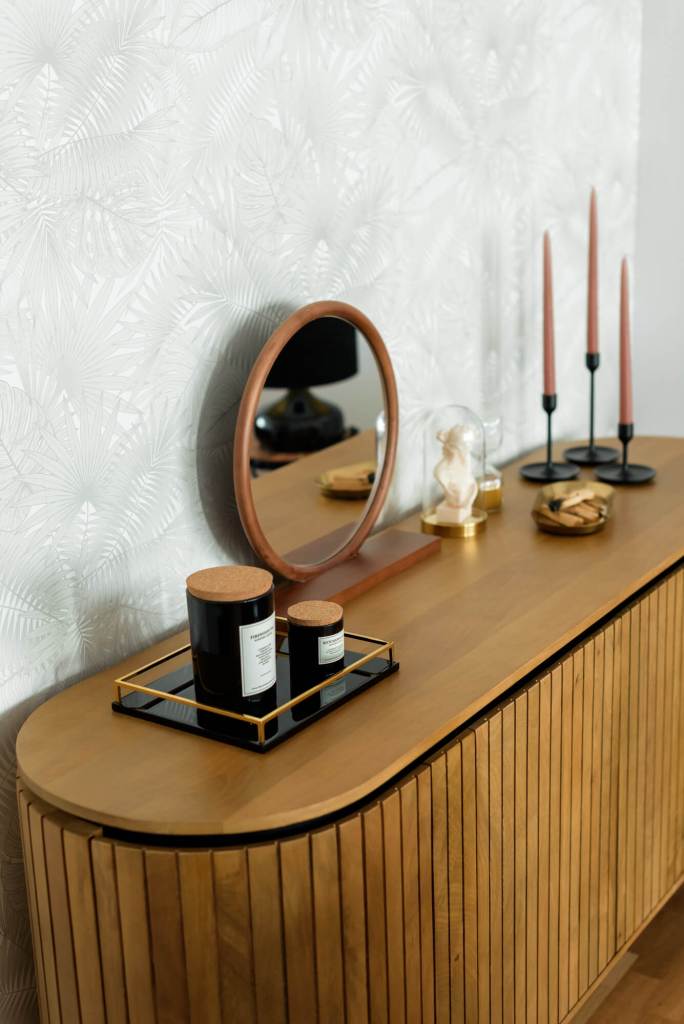 Amenajarea apartamentului în stil eclectic a fost gândită și realizată de proprietari, fără ajutorul unui designer de interior. Nela s-a îndrăgostit iremediabil de un bufet din lemn de mango, lângă care a adăugat o măsuță din lemn de salcâm, dar și masa din dining, făcută din lemn de eucalipt, care completează perfect spațiul.