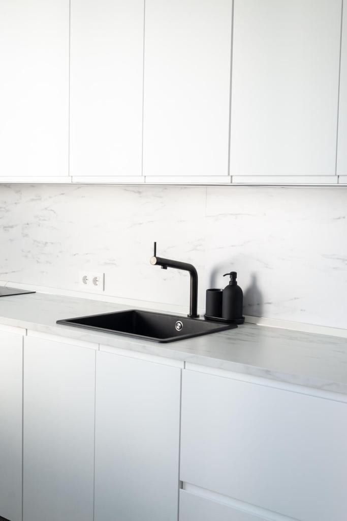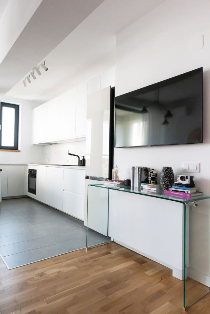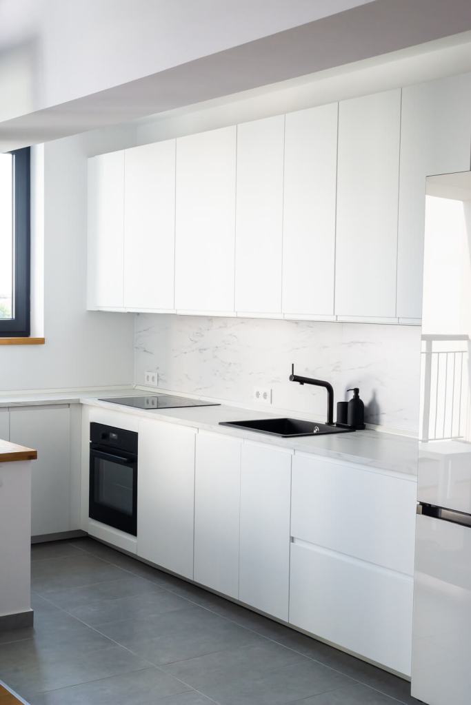Livingul, zona de dining și bucătăria formează un open space, așa că au dorit ca mobilierul din bucătărie să fie unul simplu, alb și minimalist. Cu un buget mediu, au configurat-o și realizat-o la magazinul IKEA, pentru a se asigura că se încadrează în spațiul disponibil. Datorită geamurilor mari, bucătăria este luminoasă, iar mobilierul ales nu încarcă deloc din punct de vedere vizual, din contră.