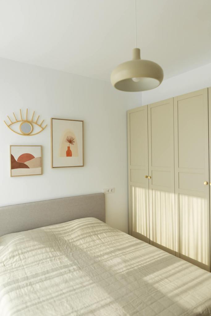 În dormitor, cei doi au mers pe un stil cald, în culori și materiale naturale, cu perdele fluide și opace, deoarece nu au vrut să încarce locul și cu draperii. Ca în restul casei, și în dormitor majoritatea pieselor sunt de la Kave Home, combinate cu câteva obiecte de mobilier de la IKEA.