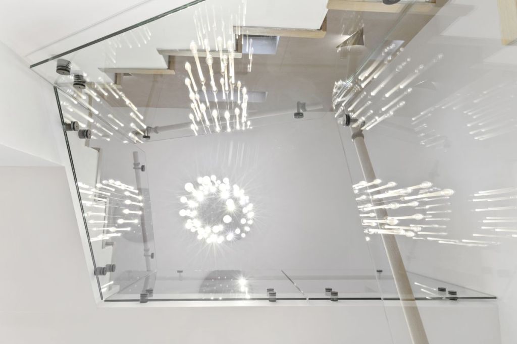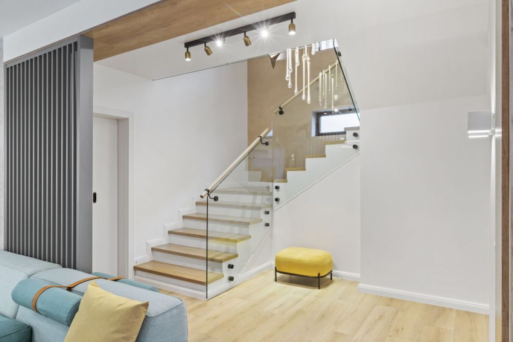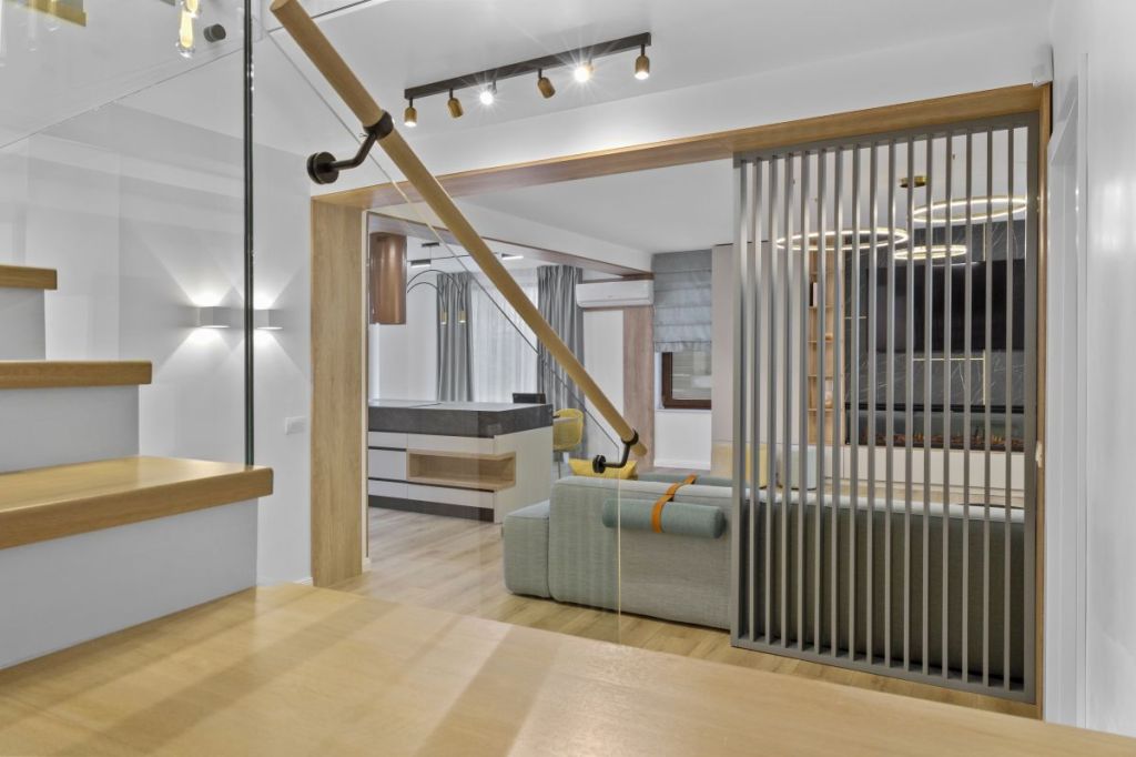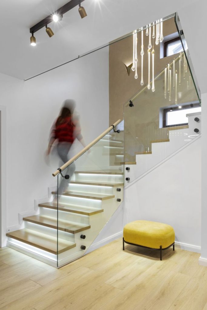 Conceptul de amenajare a fost ghidat de atenția pentru detaliu și crearea unor efecte scenografice în mai multe zone ale casei. Alina nu a ales nimic întâmplător, de la lumini, texturi sau transparențe. De exemplu, în cazul treptelor, a optat pentru un sistem de aprindere progresivă pe senzor. Adică fiecare treaptă se aprinde pe măsură ce urci. Balustrada este una din sticlă clară pentru a scoate în evidență spectacolul de lumini creat de sistemul de senzori.