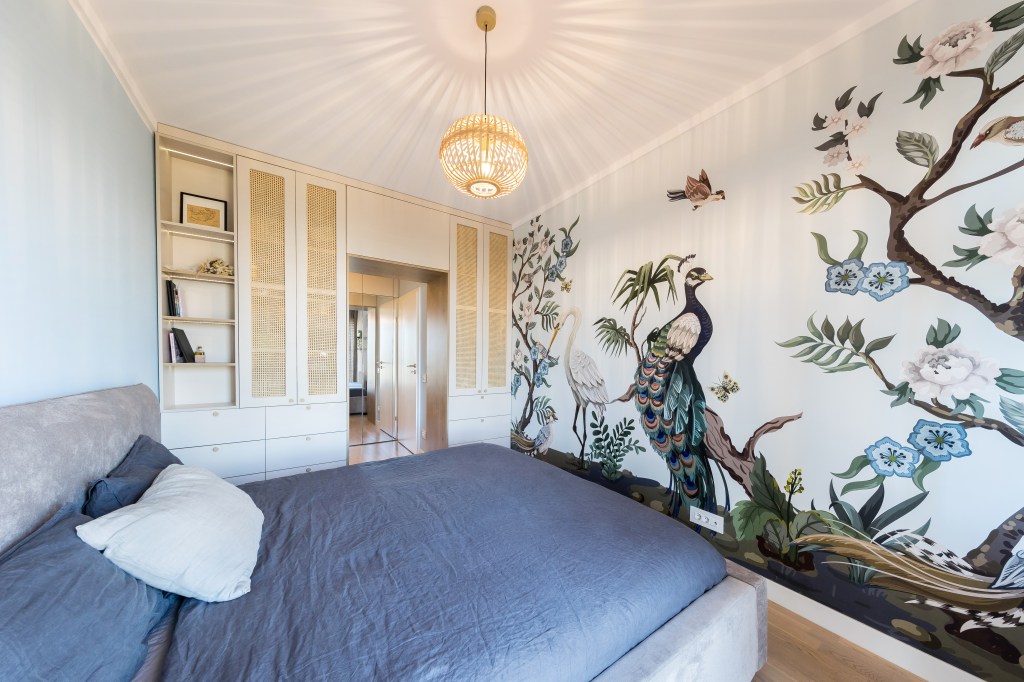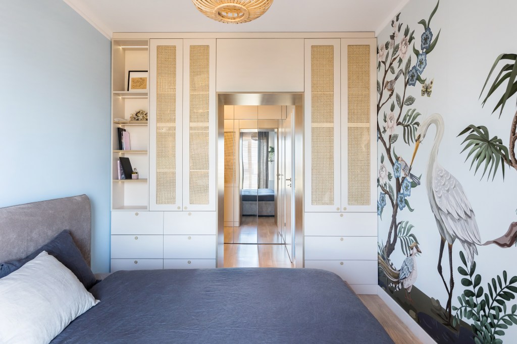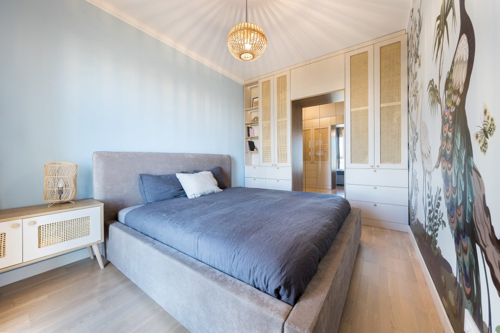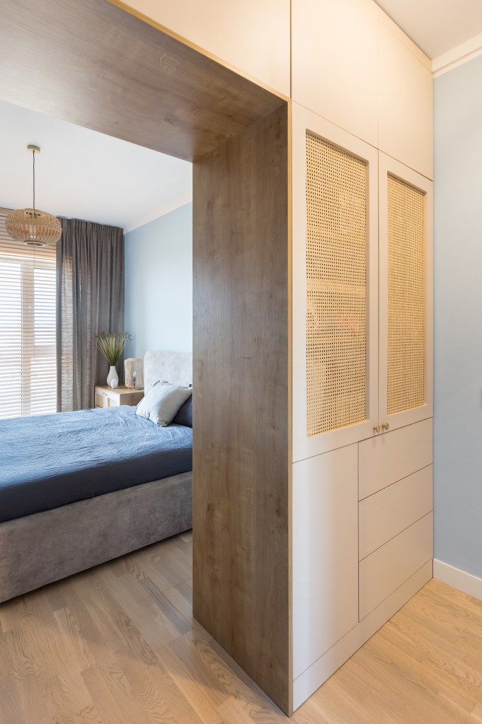 Dimensiunea dormitorului matrimonial le-a permis celor doi designeri să obțină spațiu de depozitare generos. Forma alungită a încăperii a contat și ea mult. Cosmina și Daniel au profitat de această configurație, proiectând un ansamblu de mobilier care delimitează zona de odihnă de dressing. Această intervenție a adus un plus de intimitate, dar a și dublat suprafața dulapurilor. Este încăperea în care au fost integrate cele mai multe elemente boho, de la împletitura de rattan folosită pentru ușile dulapurilor, până la culorile și grafica tapetului. Jaluzelele de lemn au fost o prefereință a beneficiarilor, fiind un element care completează aerul de vacanță care definește acest spațiu.