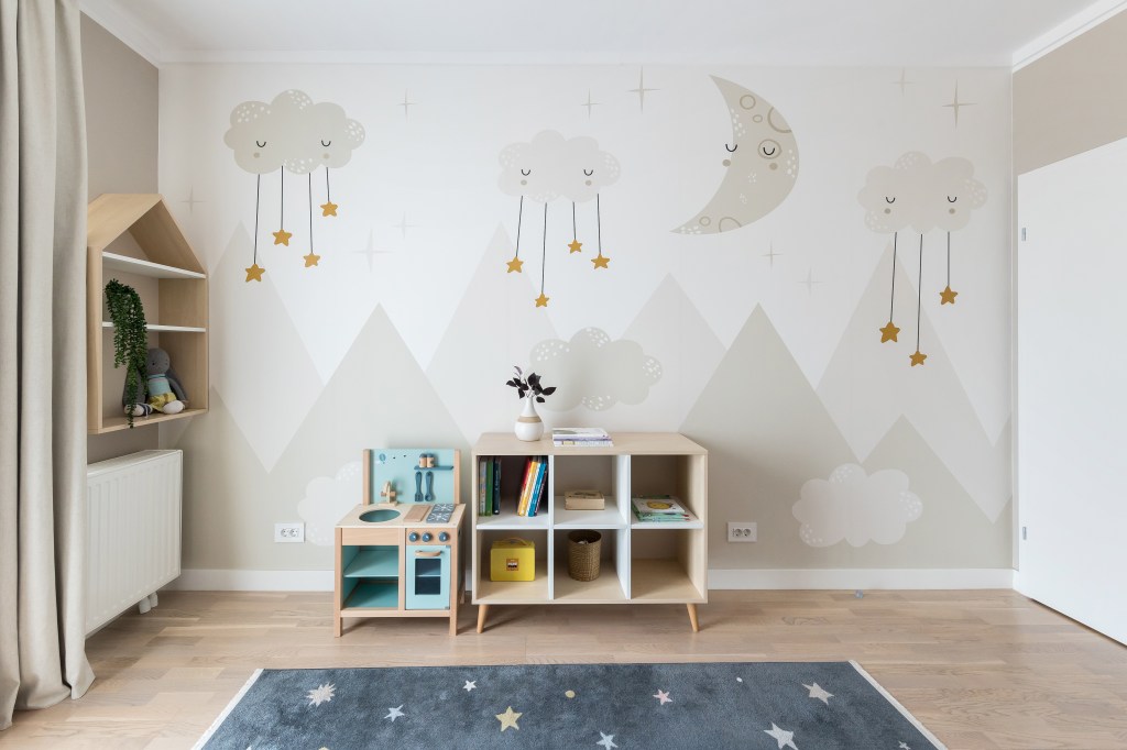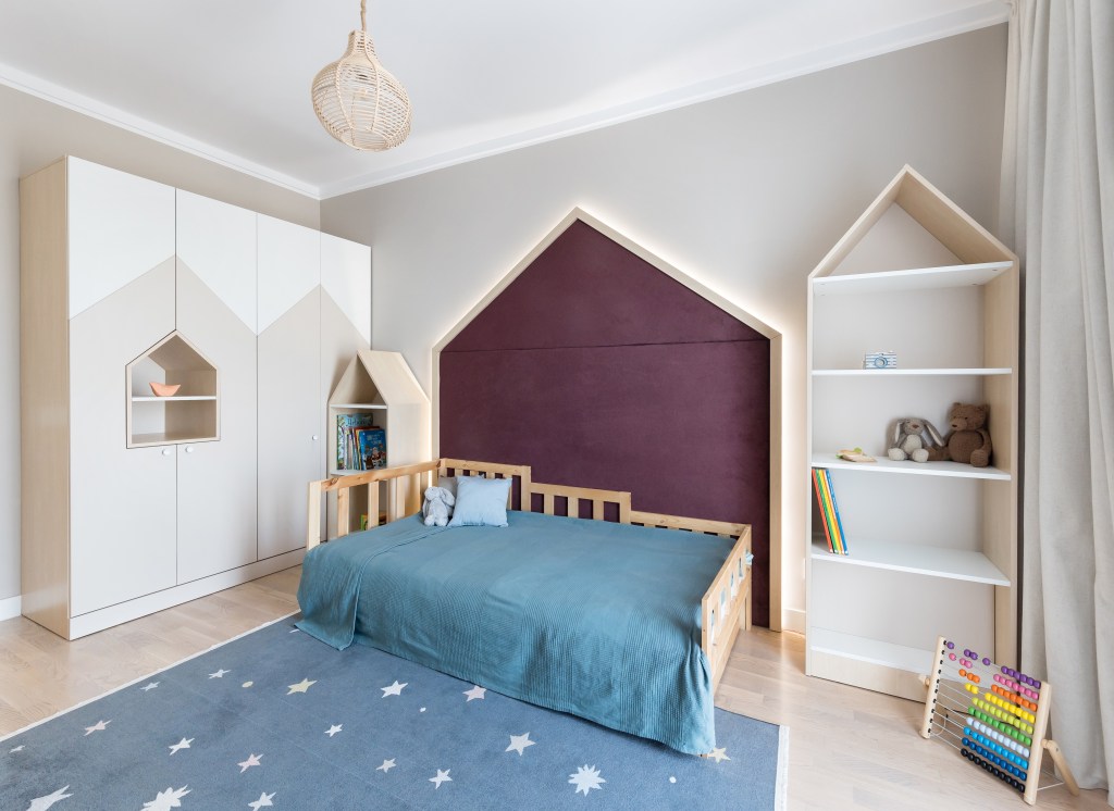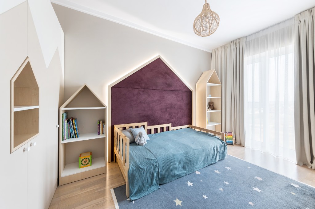 În dormitorul copilului, și-au dorit să creeze o atmosferă deopotrivă ludică și liniștitoare. Volumetriile și grafica trimit gândul către joc și poveste, în timp ce gama cromatică este alcătuită din nuanțe ușoare și delicate de bej, contrabalansate de tonurile mai profunde de albastru și violet. Au păstrat centrul camerei cât mai liber, pentru suficient spațiu de joacă. Au lăsat, însă, deschisă și posibilitatea adăugării unui birou atunci când va fi necesar”.