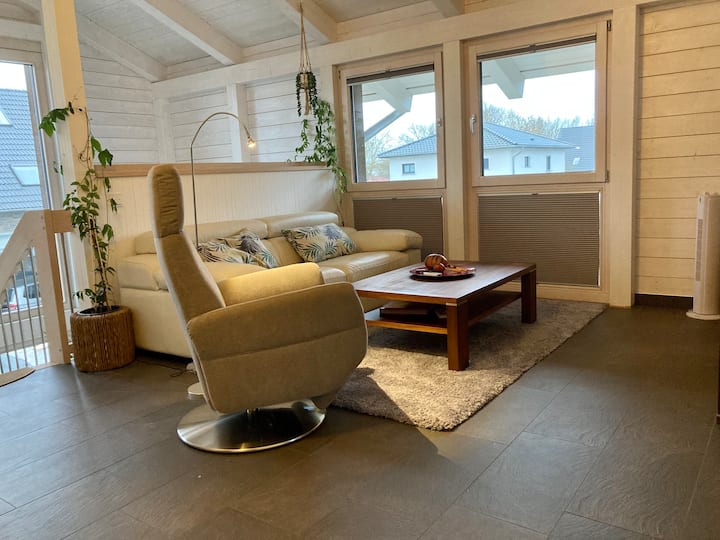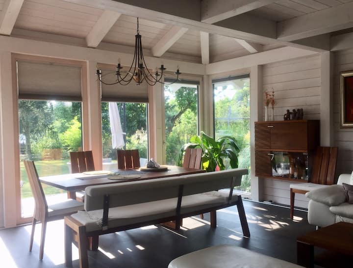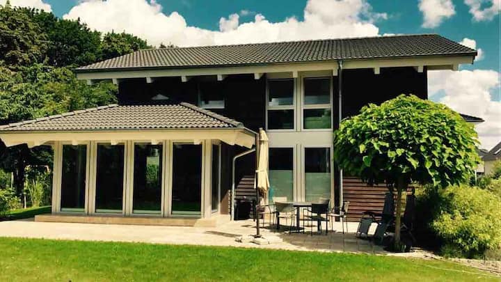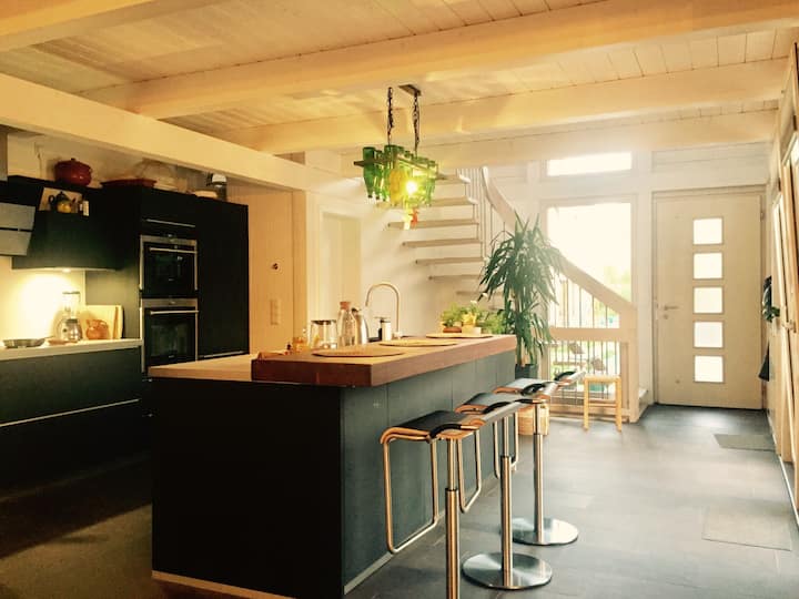 Ce-ar fi ca-n noaptea dintre ani să faci o extravaganță și să închiriezi o casă pentru tine și grupul tău de prieteni? Dacă nu te uiți (prea mult) la bani și-ai vrea să trăiești experiența berlineză în peisajul confortabil al unui cartier rezidențial de lângă Berlin, această casă poate fi una potrivită pentru tine. Proprietatea propune patru dormitoare, cinci paturi și două băi și poate găzdui maximum opt persoane. Casa este decorată modern, are bucătărie complet utilată, spațioasă și luminată generos, cu vedere la curtea mare din fața locuinței. Bucătăria, sufrageria și dormitorul matrimonial se află la parter, iar celelalte trei dormitoare la etaj, cu baie comună.