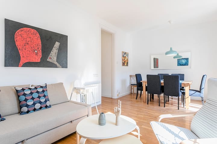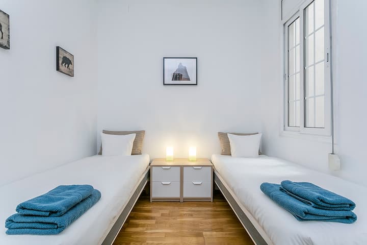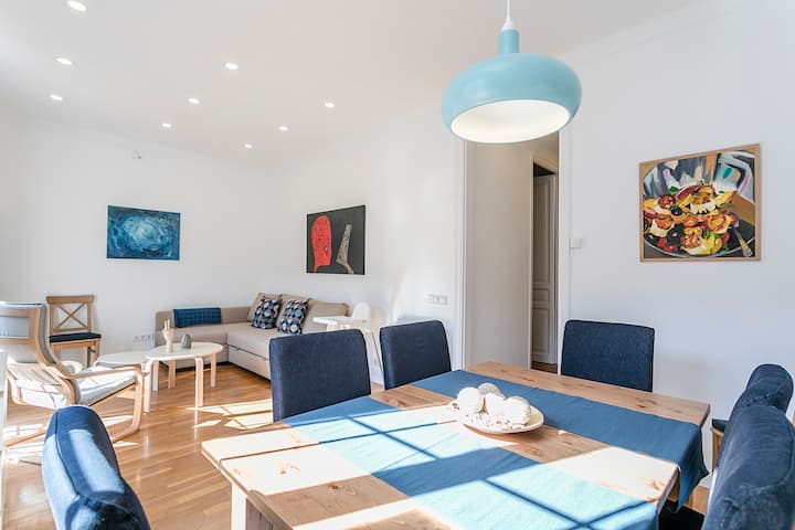 Am găsit pentru tine un loc care să-ți aducă marea în suflet, chiar și-n miezul iernii. Un apartament decorat în tonuri de albastru și alb, recent renovat, la doar câțiva pași de Plaza España și Fântâna Montjuic, locul în care se întâmplă totul în Barcelona. Acest apartament modern de 85 metri pătrați, cu trei dormitoare și șase paturi, pretabil pentru un grup de șapte persoane, te ajută să simți esența centrului orașului, cu arhitectura lui inconfundabilă, cultura și gastronomia spaniole. Locația este excelentă, iar cei care s-au cazat, deja, aici au apreciat curățenia și faptul că aparatamentul este utilat cu tot ceea ce este nevoie pentru un sejur confortabil.