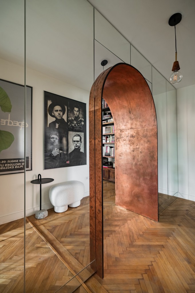 Holul apartamentului este o adevărată expoziție, cu fotografii semnate Brian Kosoff și referințe Depeche Mode. Zona a fost tratată cu marmorino gri închis de la IR colours, o nuanță cu personalitate care pune în valoare exponatele și lumina. Biblioteca găzduiește și zonă de dining și comunică cu livingul prin două uși franțuzești, cu panouri de sticlă. Livingul este cea mai luminoasă încăpere din tot apartamentul și cea mai colorată.