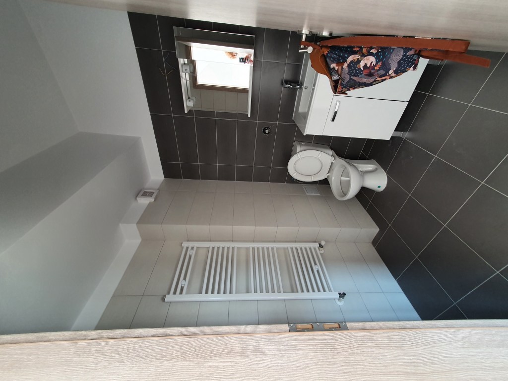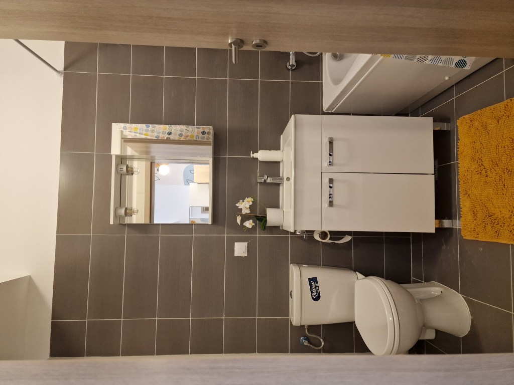 Baia are 4 metri pătrați, în mod normal, suficient pentru a monta aici o mașină de spălat rufe. Poziționarea caloriferului în mijlocul peretelui a eliminat însă această posibilitate. Gabi a păstrat finisajele grej, găsite la preluarea proiectului, dar a spart monotonia prin accente de culoare: perdeaua de duș cu imprimeu geometric sau covorașul galben.