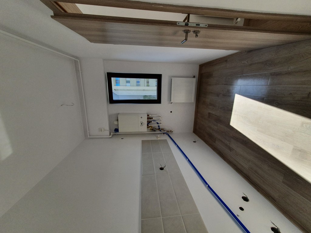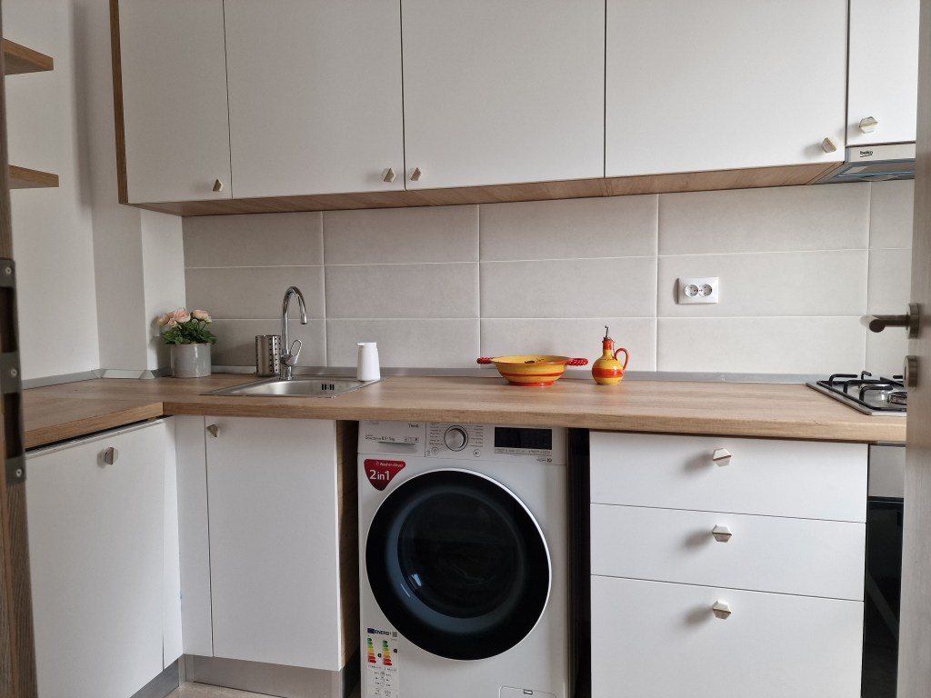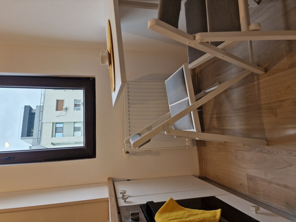 „În bucătărie au fost mai multe probleme. Furtunul de la centrală, care traversează tot peretele în partea de jos, nu a permis lipirea mobilierului de zid. Am mers pe varianta mobilierului făcut pe comandă, pentru o adâncime mai mică a dulapurilor. Asta a crescut însă binișor costurile proiectului. Fiind un spațiu atât de mic, a trebuit să caut și electrocasnice care să aibă dimensiuni atipice. De exemplu, mașina de spălat vase are doar 45 centimetri lățime”, spune Gabi.
