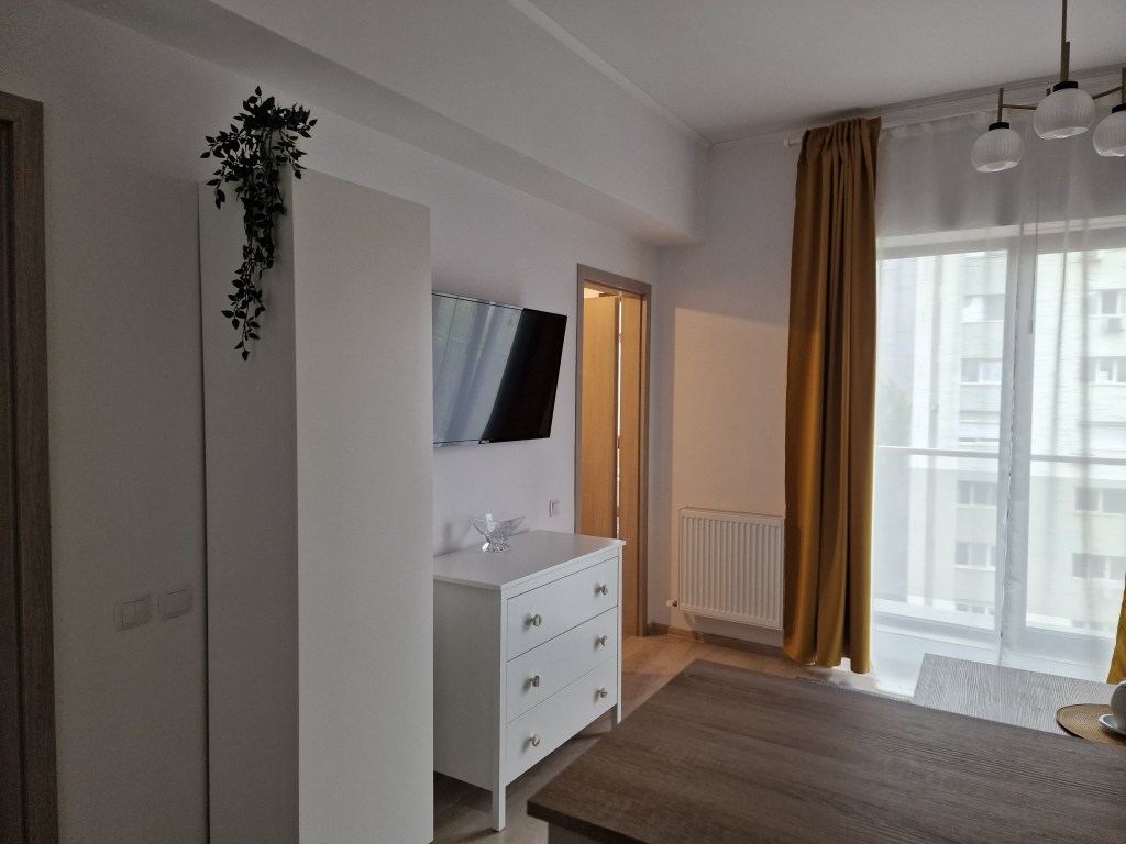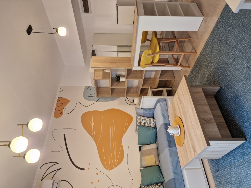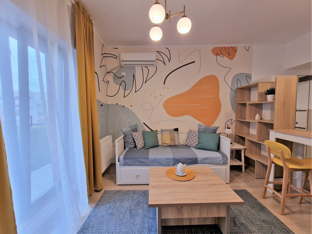 Din punct de vedere estetic, Gabi a încercat să obțină o amenajare cât mai fresh. A folosit un tapet cu forme abstracte de la Mivali pentru a delimita vizual livingul. Încăperea se bucură de multă lumină naturală. Asta, combinat cu fundalul alb al pereților, a făcut ca spațiul să nu pară deloc încărcat. Corpurile de iluminat sunt de la Mobexpert, iar mobilierul și textilele sunt achiziționate de la Ikea. Toate obiectele folosite în amenajare sunt budget friendly, optimizarea costurilor fiind un aspect de care s-a ținut cont pe toată durata proiectului.