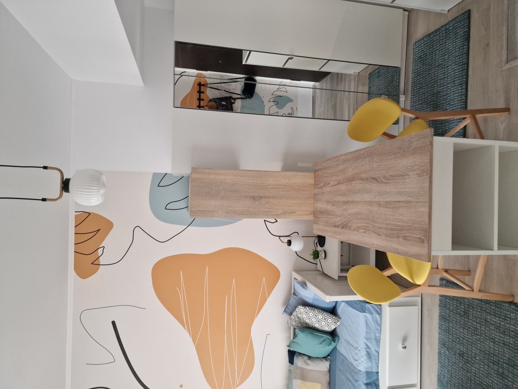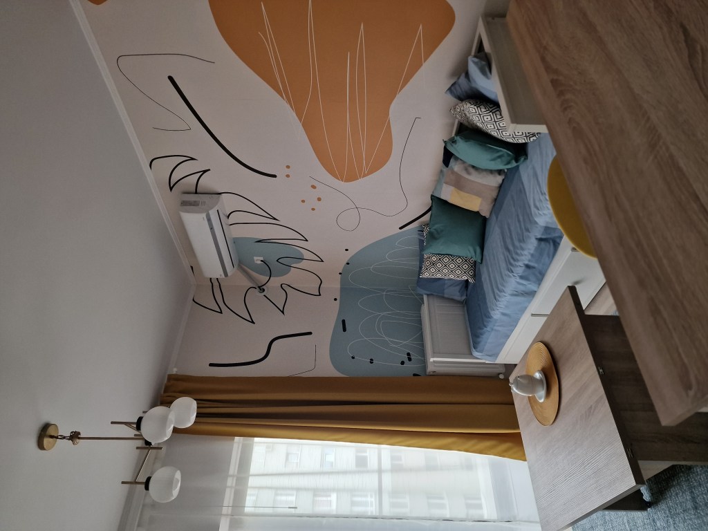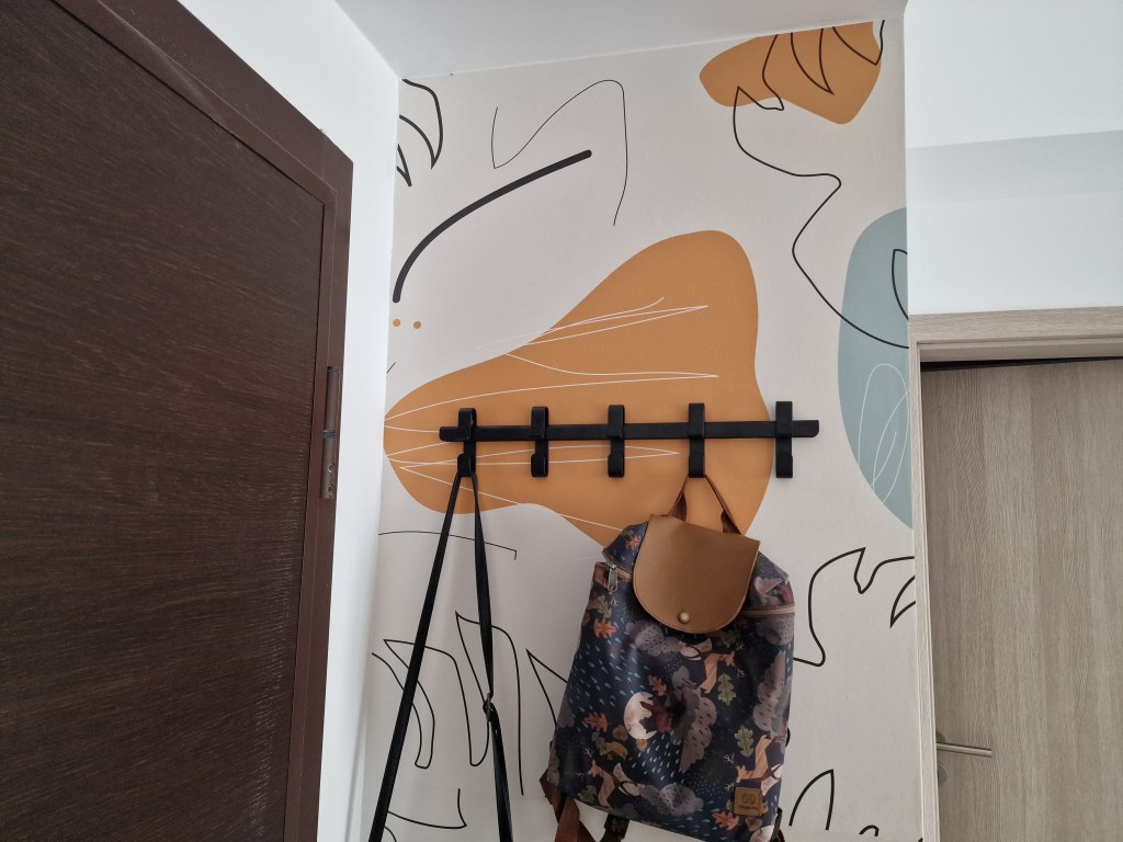 „Am încercat să pun accent pe detalii ca să adaug personalitate decorului. De exemplu, la mobila din bucătărie am folosit butoni cumpărați de la Sinsay. Este un amănunt care poate părea lipsit de importanță, dar care cântărește mult în toată povestea pe care încerci să o spui. Iarăși, îmi place tapetul care îmbracă spațiul fără să îl aglomereze. M-am bucurat să văd că proprietarii au fost de acord să folosim culoare într-un spațiu de închiriat. De obicei, în aceste situații se merge pe varianta sigură a culorilor neutre. A fost o decizie inspirată. Dovadă că au găsit chiriaș de la prima vizionare”, spune Gabi.
